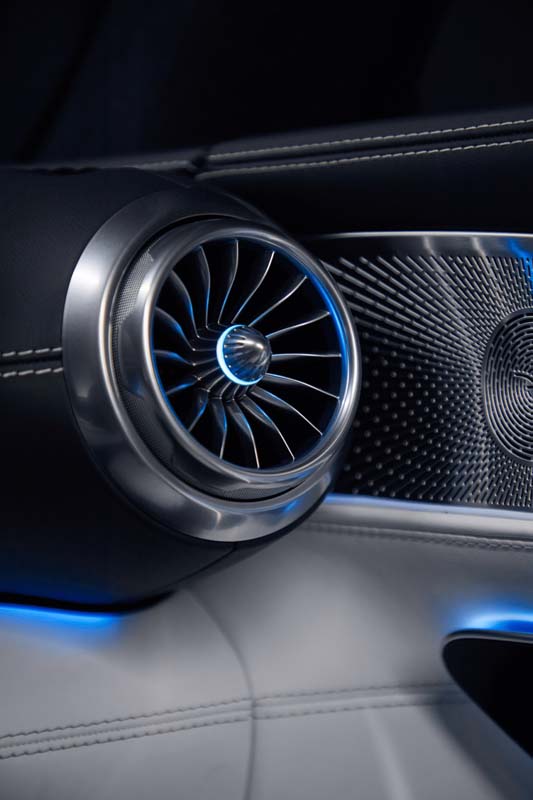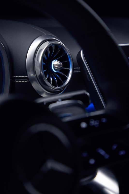 The centre console dominates the space between the driver and front passenger. Of maximum width and rising sharply towards the front, it flows into the lower section of the instrument panel. The functional and visual centre of the centre console is the metallic panel that breaks through the leather surfaces at the front and rear. Featuring the NACA air intake signature, it carries on the genes of the AMG GT and GT 4-Door Coupé. This design element thus becomes a hallmark AMG stylistic element in the interior. The NACA air intake transitions almost seamlessly into the 11.9-inch multimedia touchscreen in portrait format. To avoid reflections caused by sunlight when driving with the top down, this screen can be adjusted electrically into a more vertical position. Its portrait format offers clear advantages, especially for navigation, as well as more space ergonomically. The touchscreen floats between the two central turbine nozzles as a digital contrast to emotive design elements.