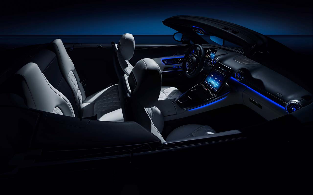 The interior design of the upcoming SL transforms the iconic tradition of the first 300 SL Roadster into the modern era. Thanks to its Mercedes-AMG performance genes, the new edition caters to the sporty target group as well as customers looking for maximum comfort. Fine materials, meticulous workmanship and attention to detail further underscore the high luxury standards in the interior. The cockpit design, right down to the adjustable central display in the centre console, is focused on the driver and impresses with a harmonious overall impression. The completely redesigned dimensional concept with 2+2 seats offers more function and space in the interior at the same time. The MBUX infotainment system offers a choice of several specific display styles and different modes.