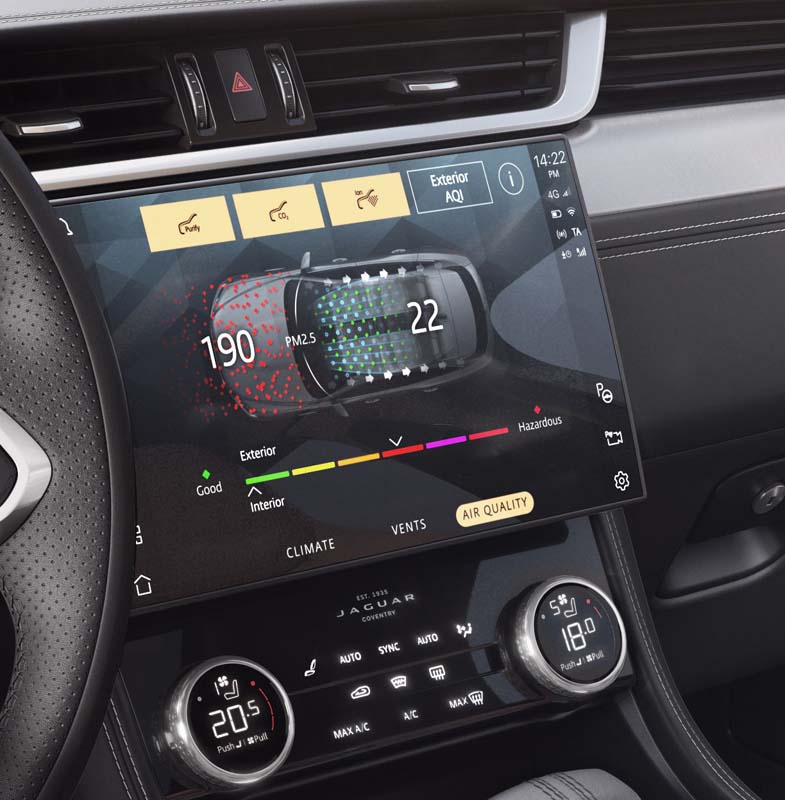 The first of these is called Air Purge, and it delivers benefits before the journey even begins by using the climate control system’s fans and recirculation function to freshen the air inside the vehicle before the doors are opened. This is achieved either by setting a departure time through the infotainment touchscreen or the Jaguar Remote App.