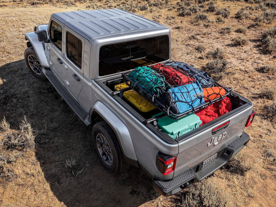An available spray-in bed liner, bed divider and tonneau cover provide even more options to keep cargo secure while helping with durability. Jeep Gladiator Rubicon models are equipped with protective cab and cargo bed rock rails.