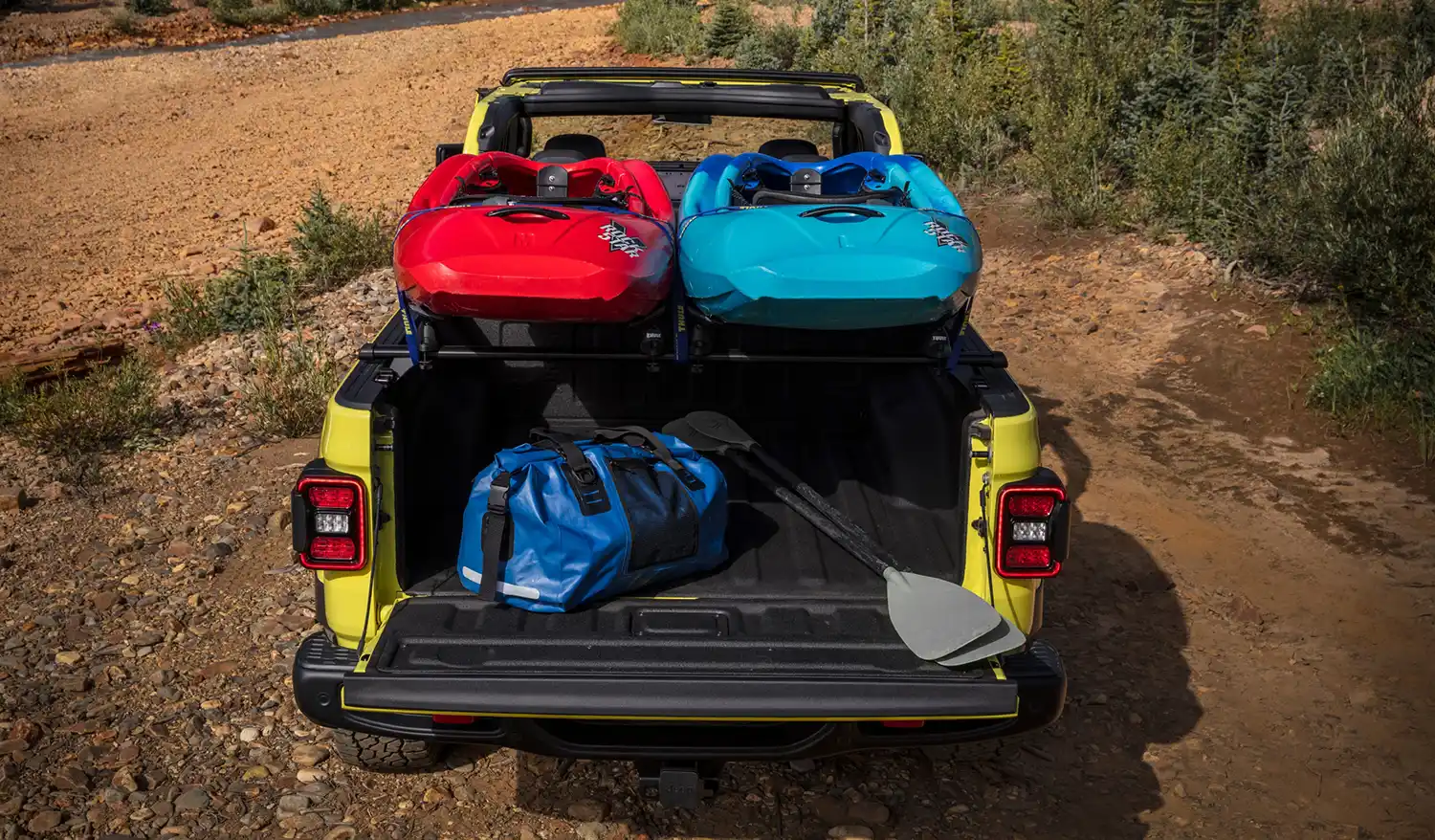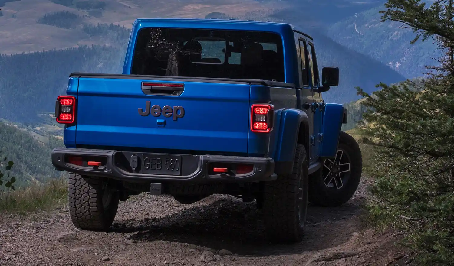 Every Gladiator model’s Trail Rated or Desert Rated badge reflects an unmatched spec list that includes Dana 44 heavy-duty front and rear axles, two-speed transfer case, traction control, tow hooks (two front, up to two rear), four-wheel disc brakes, three skid plates and a minimum tire size of 32 inches.