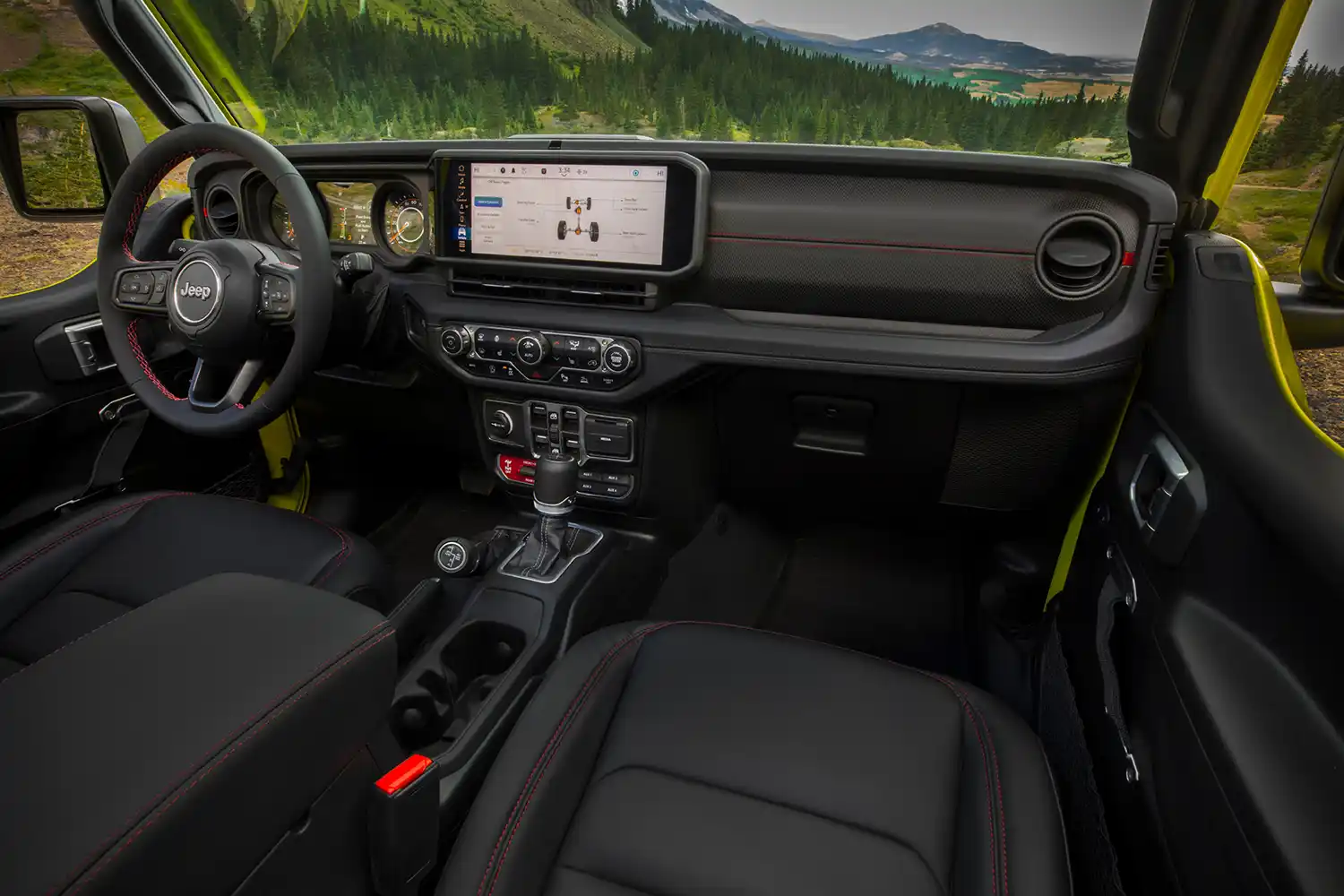 An all-new 12.3-inch touchscreen – the most advanced and largest display ever offered on Gladiator – houses the fifth-generation award-winning Uconnect 5 system and sits prominently atop the center stack, right above the new slim rectangular inboard air vent. Using full-array local dimming (FALD) backlight technology, the 12.3-inch screen delivers improved visibility, especially during open air conditions with the top and doors off. The outboard air vents retain their signature circular shape. Standard on all models is improved hands-free voice recognition, which uses new seven-microphone array technology.