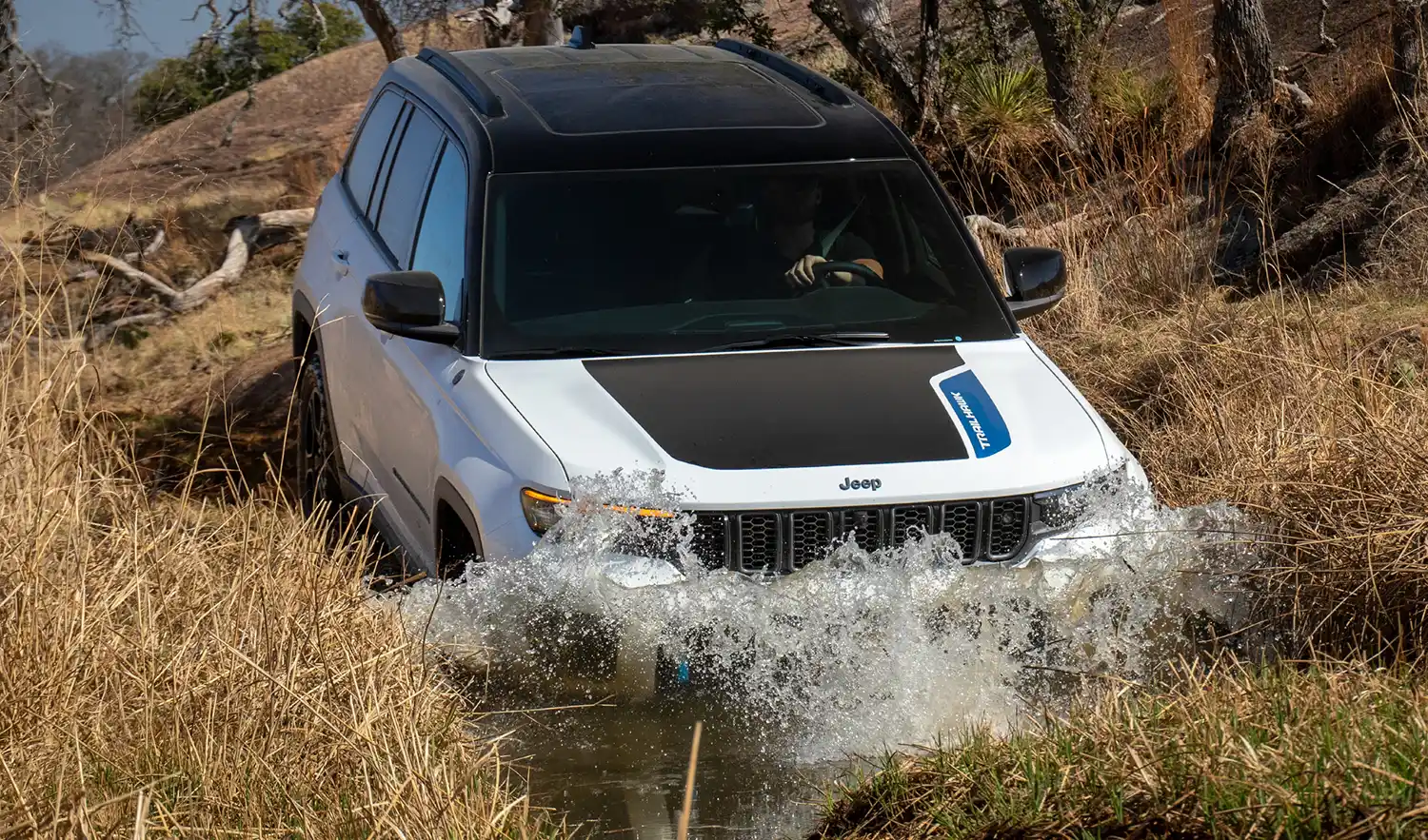 - Glare-proof black-and-blue matte “Trailhawk” hood decal