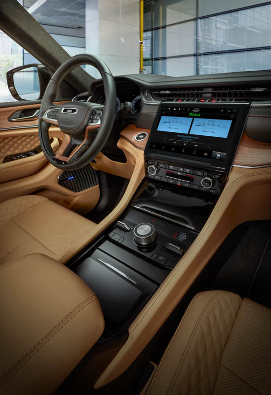 Also new for Grand Cherokee L is a standard 10.25-inch frameless digital gauge and cluster with nearly two dozen different menus from which the user can select. The full-color cluster features five reconfigurable tiles for at-a-glance data or quick and easy access to the most used information. Drivers may choose between analog or digital instrumentation. All cluster settings can be saved to a user profile as part of Grand Cherokee L’s full vehicle customization and automatically recalled for each driver. On-screen graphics are delivered in real-time, animated 3D.