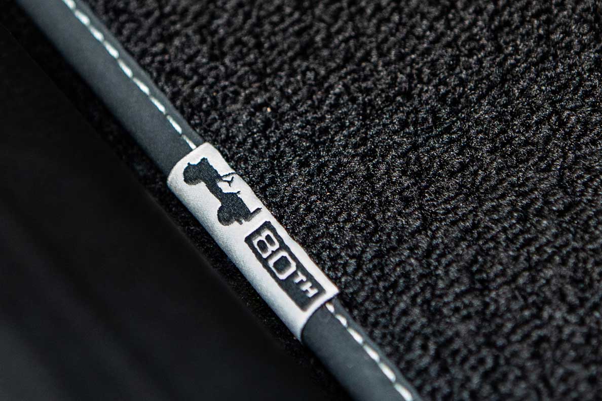 Inside the cabin are diamond pattern dark grey cloth seats (also available in black leather) with tungsten stitching and 80th Anniversary tag.