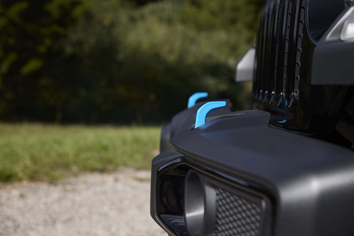 The Jeep Wrangler Willys 4xe features standard LED headlamps and fog lamps, Alpine 9-speaker premium audio, all-weather floor mats, rear limited-slip differential, rock rails, black grille, and 17-inch black-painted alloy wheels wearing LT255/75R17C mud-terrain tires. A special ‘Willys’ decal on the hood, trimmed in the 4xe’s signature Electric Blue, and an ‘Electric 4-Wheel Drive’ decal on the swing gate signify that this Willys is a 4xe plug-in hybrid. Electric Blue is also used to accent the front and rear Willys tow hooks, the Jeep badge and the Trail Rated badge. An available Sun and Screen Package, featuring the class-exclusive Sky One-Touch Power-Top and the Uconnect 4C NAV with 8.4-inch touchscreen, is optional on the Willys 4xe.
