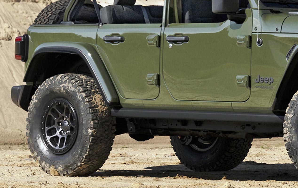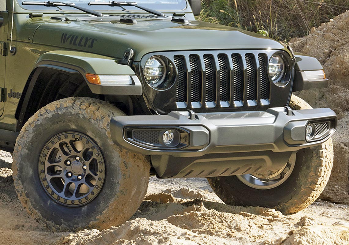 Fitted with a standard black grille, matte black “Jeep” badge, black “Trail Rated” badge, “4-Wheel Drive” swing gate decal and “Willys” hood decal, the heritage-inspired Wrangler Willys brings a unique appearance to the Wrangler lineup, bolstered for 2022 with the available Xtreme Recon 35-inch tire package.