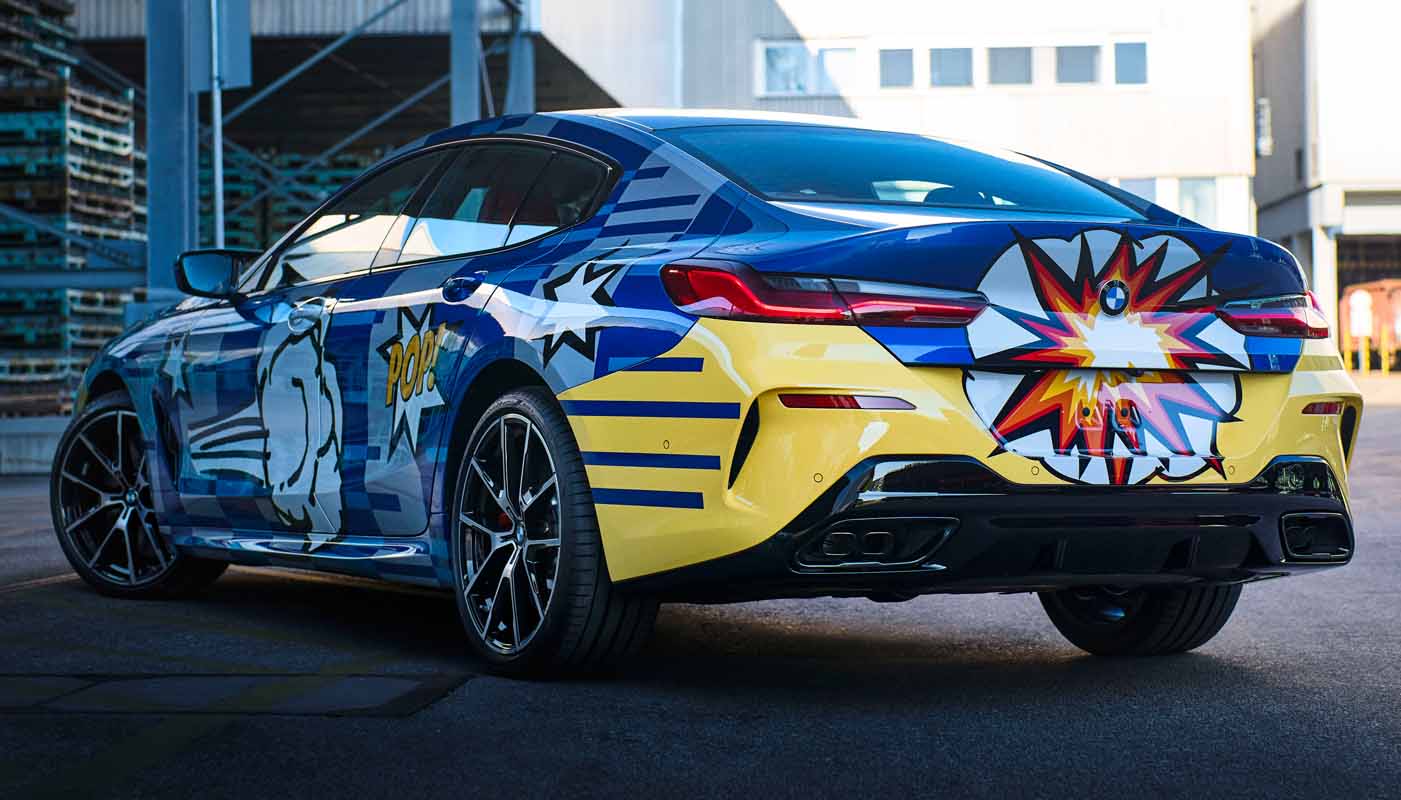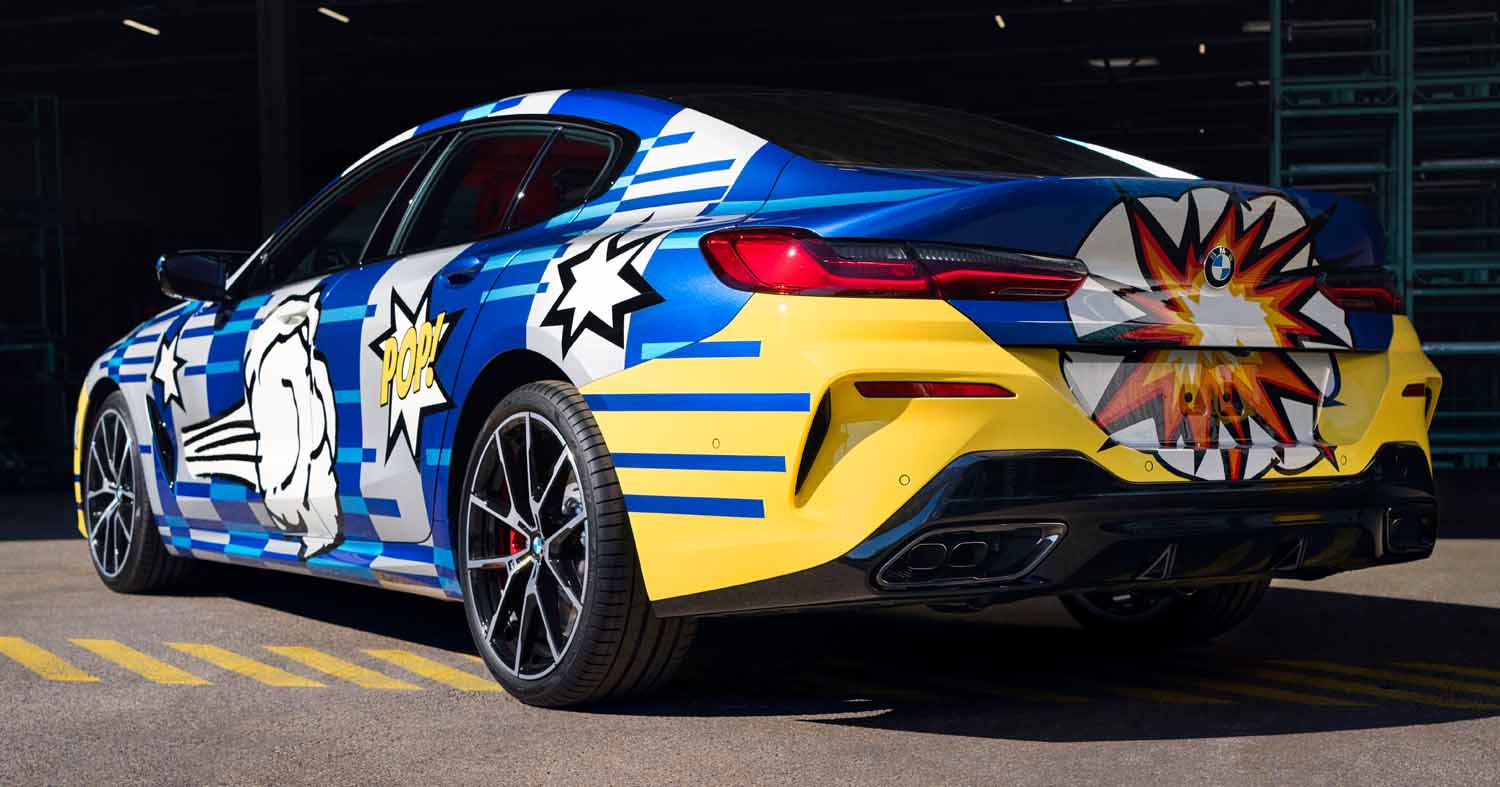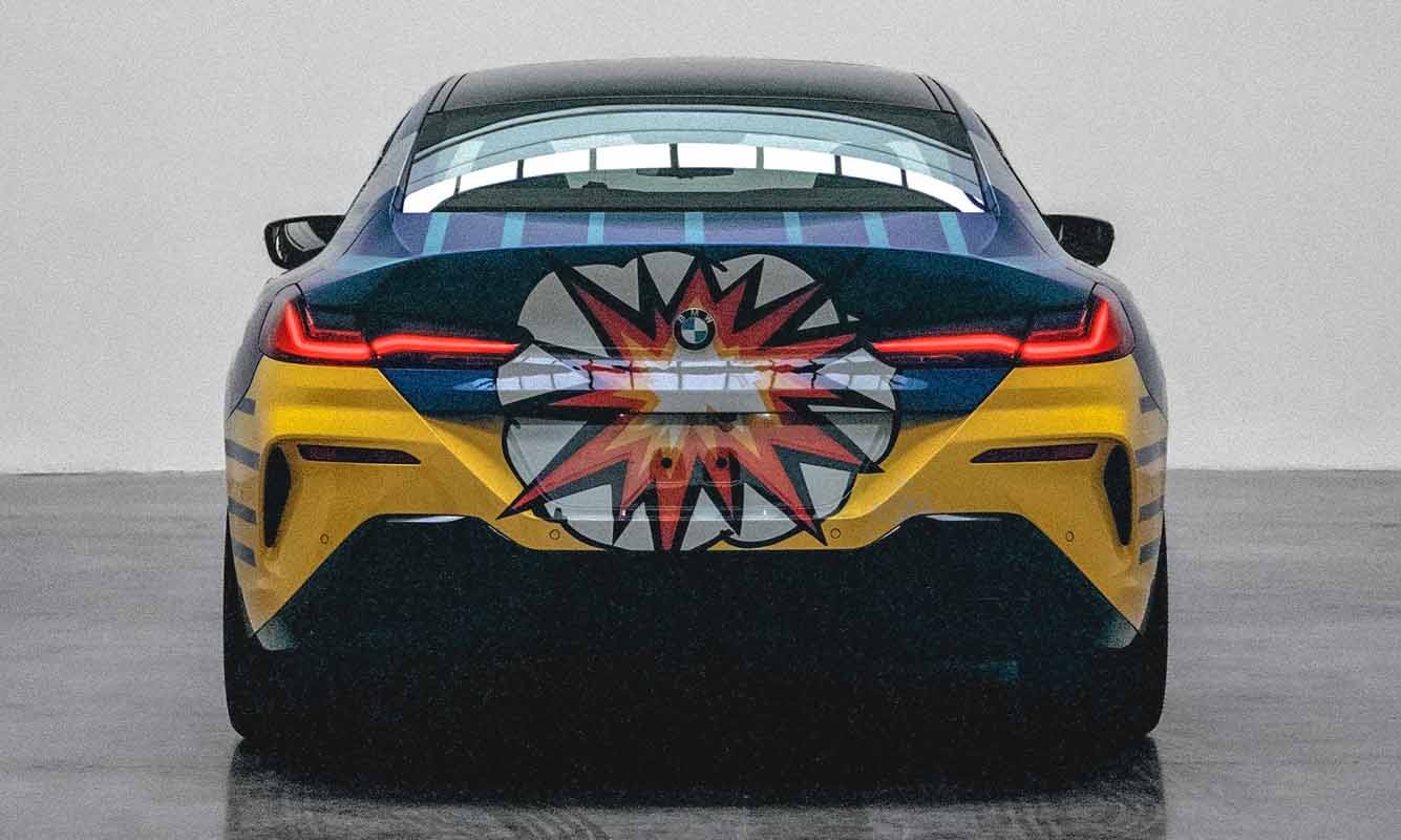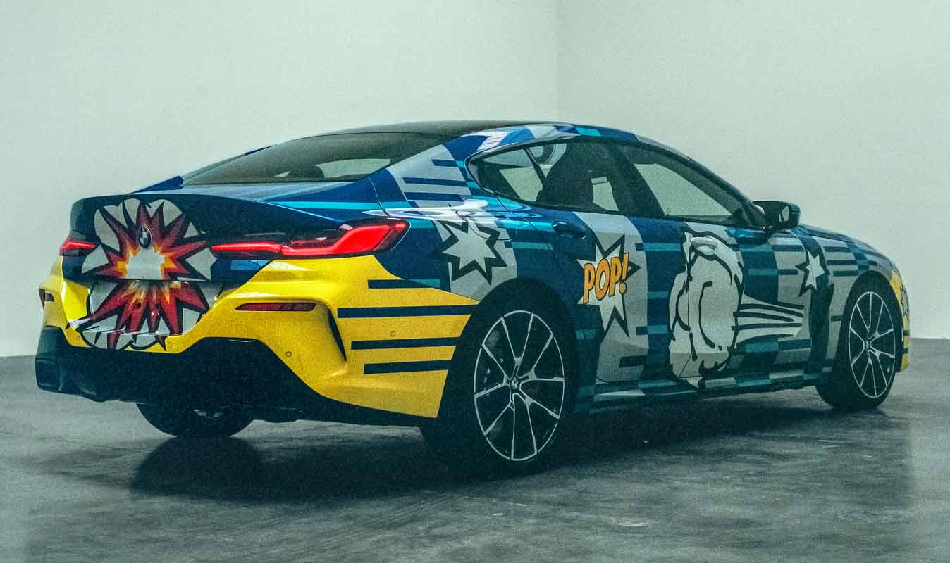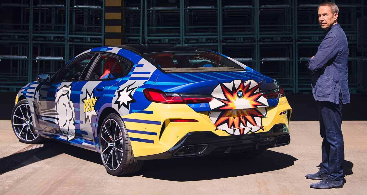 The expressive and striking design combines eleven different exterior colors ranging from blue to silver as well as from yellow to black. Only four cars will be painted each week. The multi-colored interior is comprised of high-end materials, fine leather and a cupholder lid with an edition badging and the artist’s signature. The seats are made up of the striking red and blue which reflects the colors of superheroes from the comic book universe as well as those of the company’s high-performance unit BMW M. Overall, the energetic and powerful design includes both elements of pop art as well as geometric patterns paying homage to the sporty 8 Series Gran Coupe’s intricate contours and shape. The exploding lines of color at the rear, in turn, are their own unmediated homage to the artist’s 2010 BMW Art Car, while the “POP!” on each side as well as the vapor thrust imagery symbolize the power and speed of THE 8 X JEFF KOONS, according to the artist.