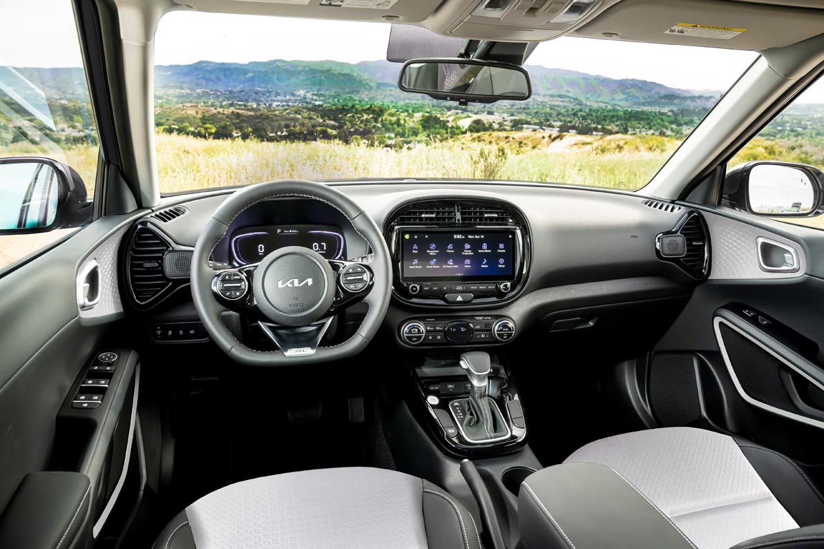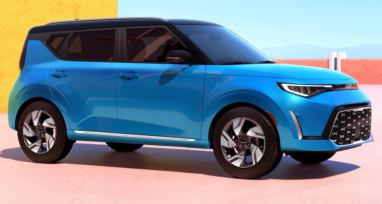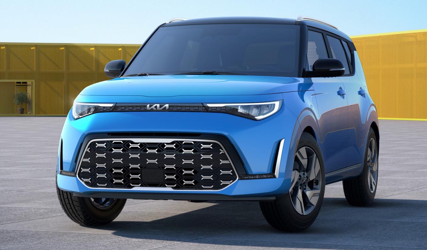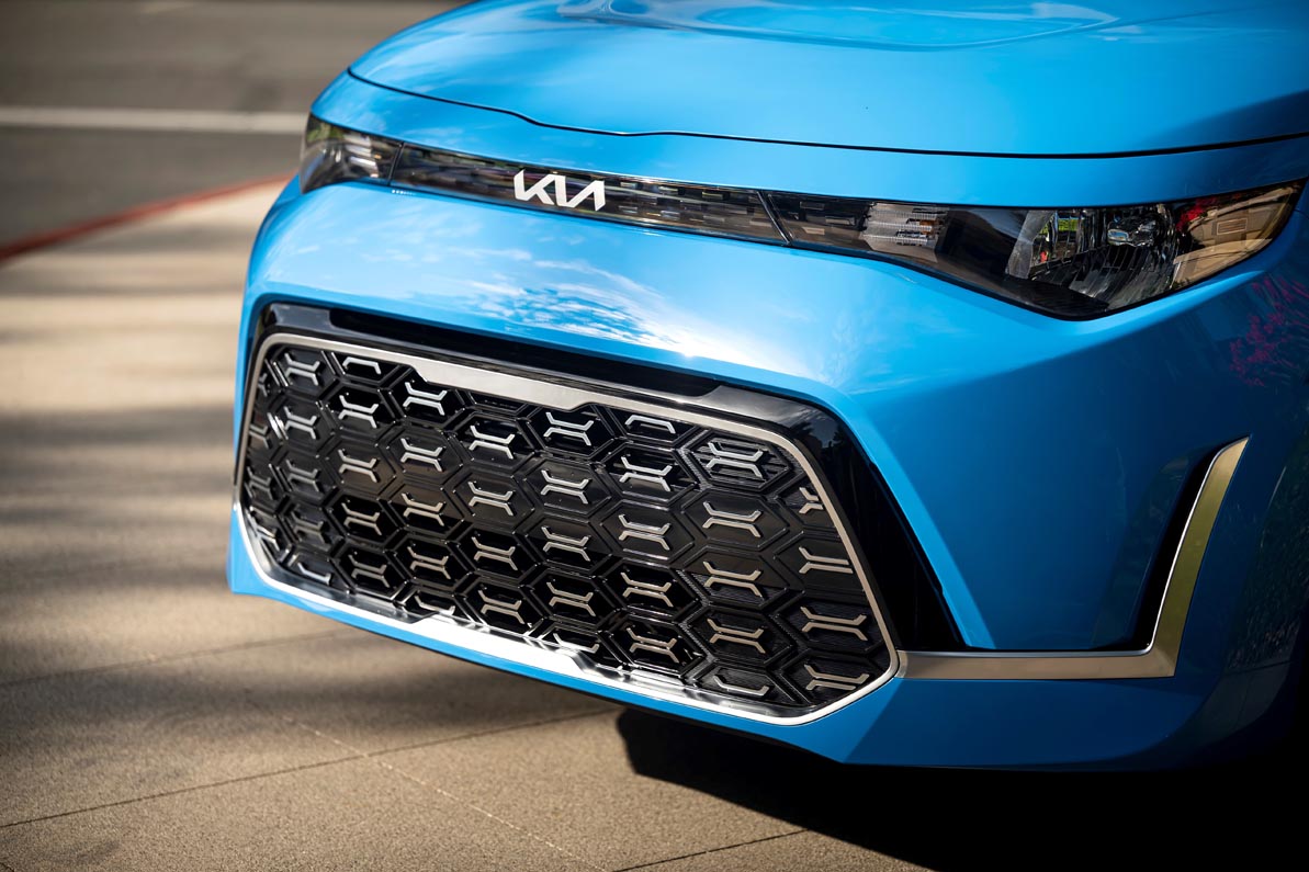 The new 2023 Kia Soul features refreshed design elements inside and out, a simplified lineup, new smile-inducing colors, and two option packages brimming with technology and convenience. The refreshed front fascia features a new grill adorned with available LED headlights and redesigned fog lights. New Daytime Running Lamps and turn signals round out the front-end redesign. New available 17- and 18-inch alloy wheels and a redesigned rear fascia and taillights complete the exterior enhancements. A multitude of solid and two-tone exterior paint schemes remain and are complemented by new two-tone paint programs: Clear White with Fusion Black roof and Surf Blue with a Fusion Black roof. Inside, well-placed switchgear falls readily to-hand while the 10.25-inch (standard on all but LX trim) touchscreen with navigation is a welcome addition to the tech-forward cabin.