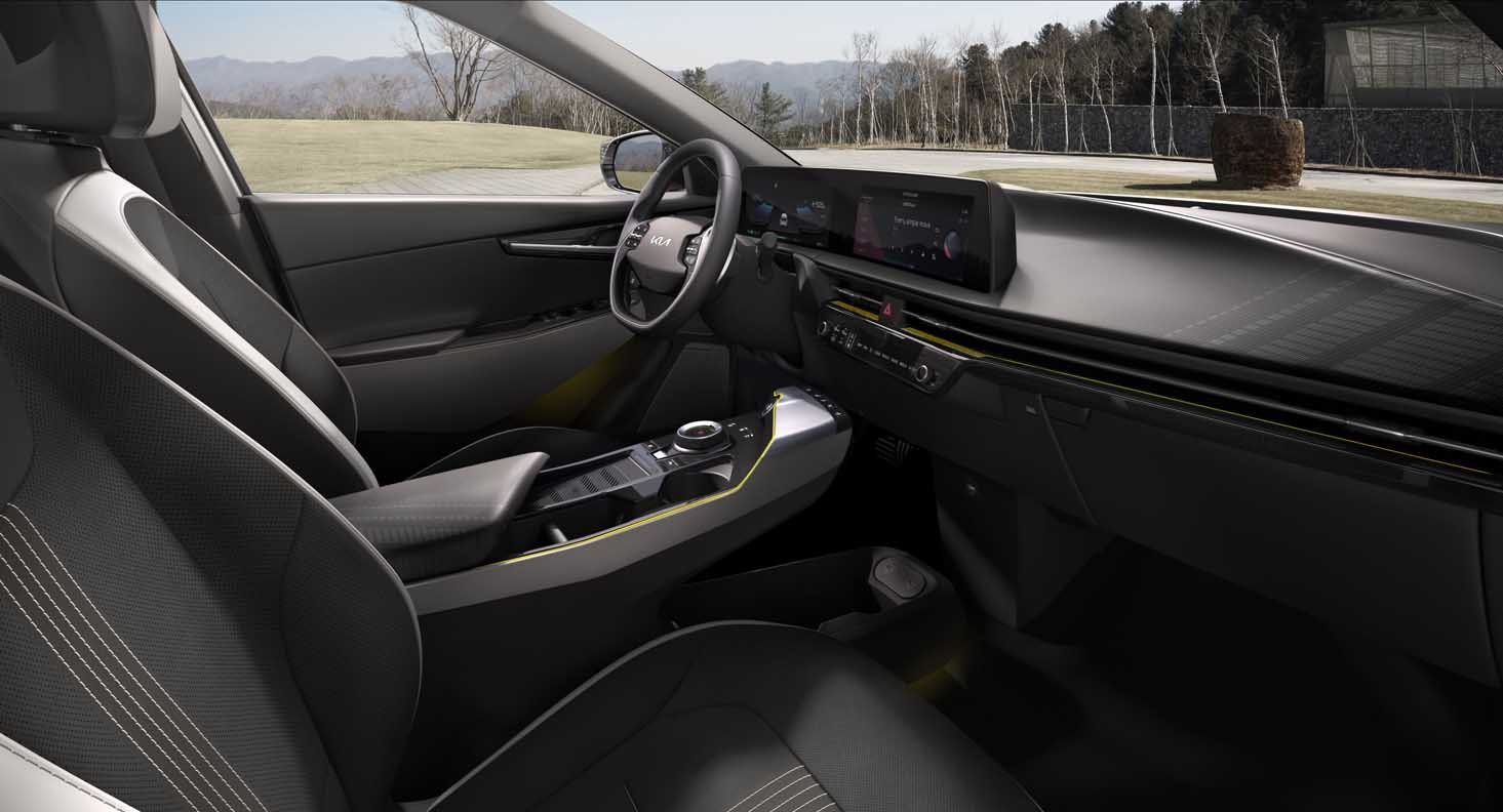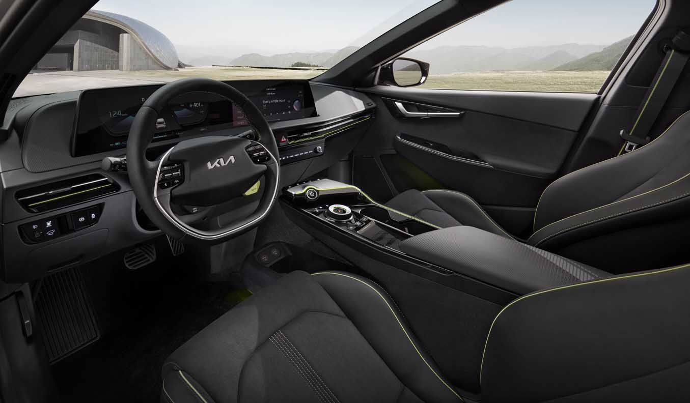 The EV6 GT features a cabin that combines sporting intent with comfort and practicality. Occupants are greeted by a set of suede-trimmed bucket seats that provide full support during spirited driving, as well as long-distance comfort for extended journeys. Metal inserts inscribed with the ‘GT’ moniker and neon green piping add to the seats’ contemporary and technical appearance. The cabin is finished throughout with premium materials, while sports-inspired touches create a purposeful ambience. A striped motif adorns the upper fascia and front centre armrest, while ambient lighting across the GT’s door panels, centre console and dashboard delivers a soothing glow during night-time driving.
