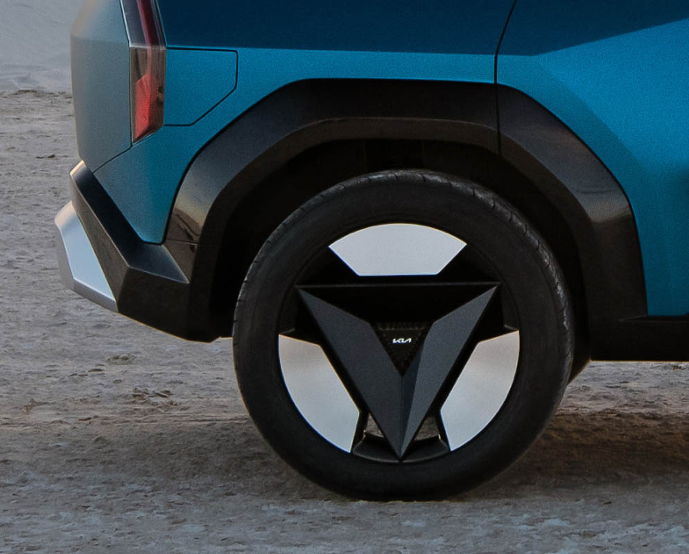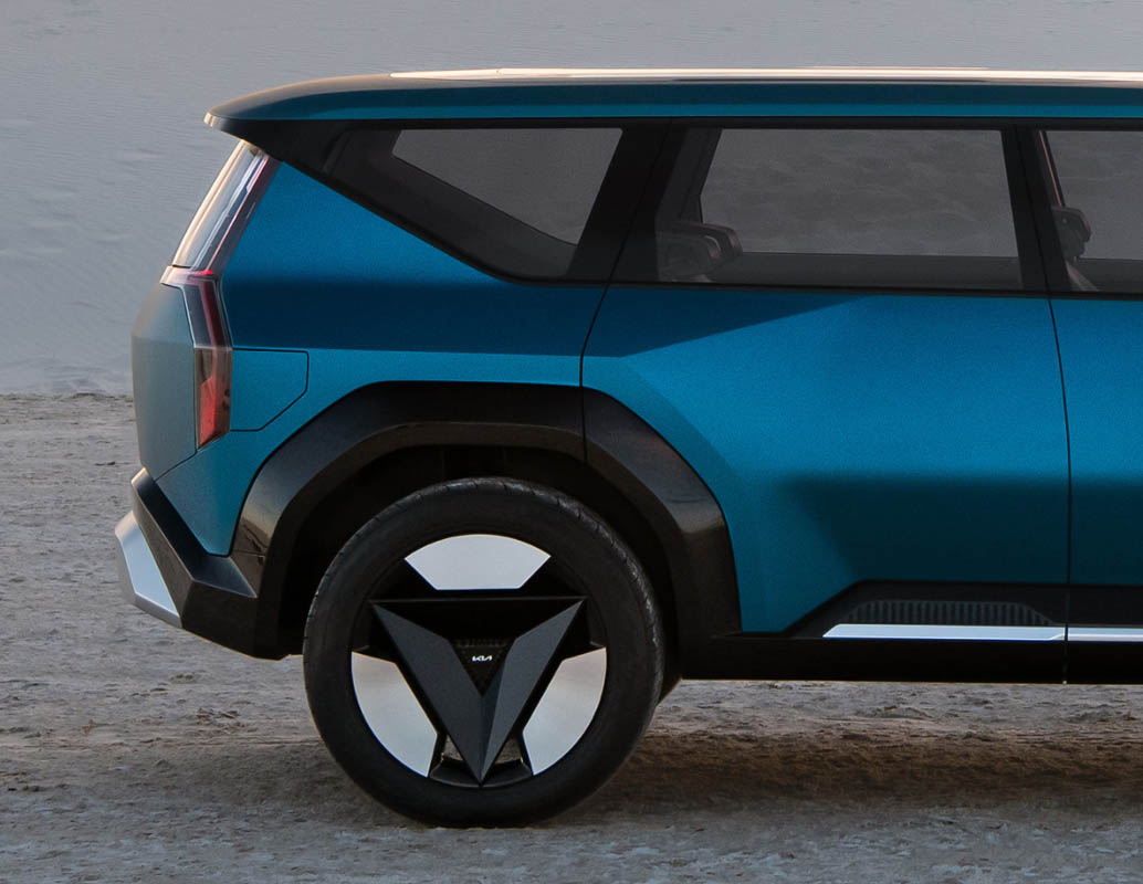 The machined 22-inch wheels further add to the geometric appearance and robust nature of the Concept EV9. A triangular aero design piece controls the airflow around the wheel and creates a visual contrast to the circular nature of the wheel to fully express the Opposites United design philosophy, making sure a balance in harmony extends into every element and section.