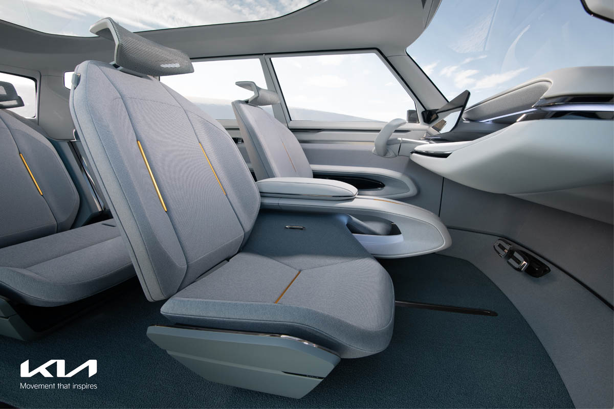 The second stationary mode is Enjoy Mode, which opens the interior into a downtime breakout space by turning around the three-row seat configuration. In this mode, the tailgate opens, giving all occupants the opportunity to connect with the outside environment and gaze ahead and beyond the vehicle while sitting comfortable inside the all-electric SUV.