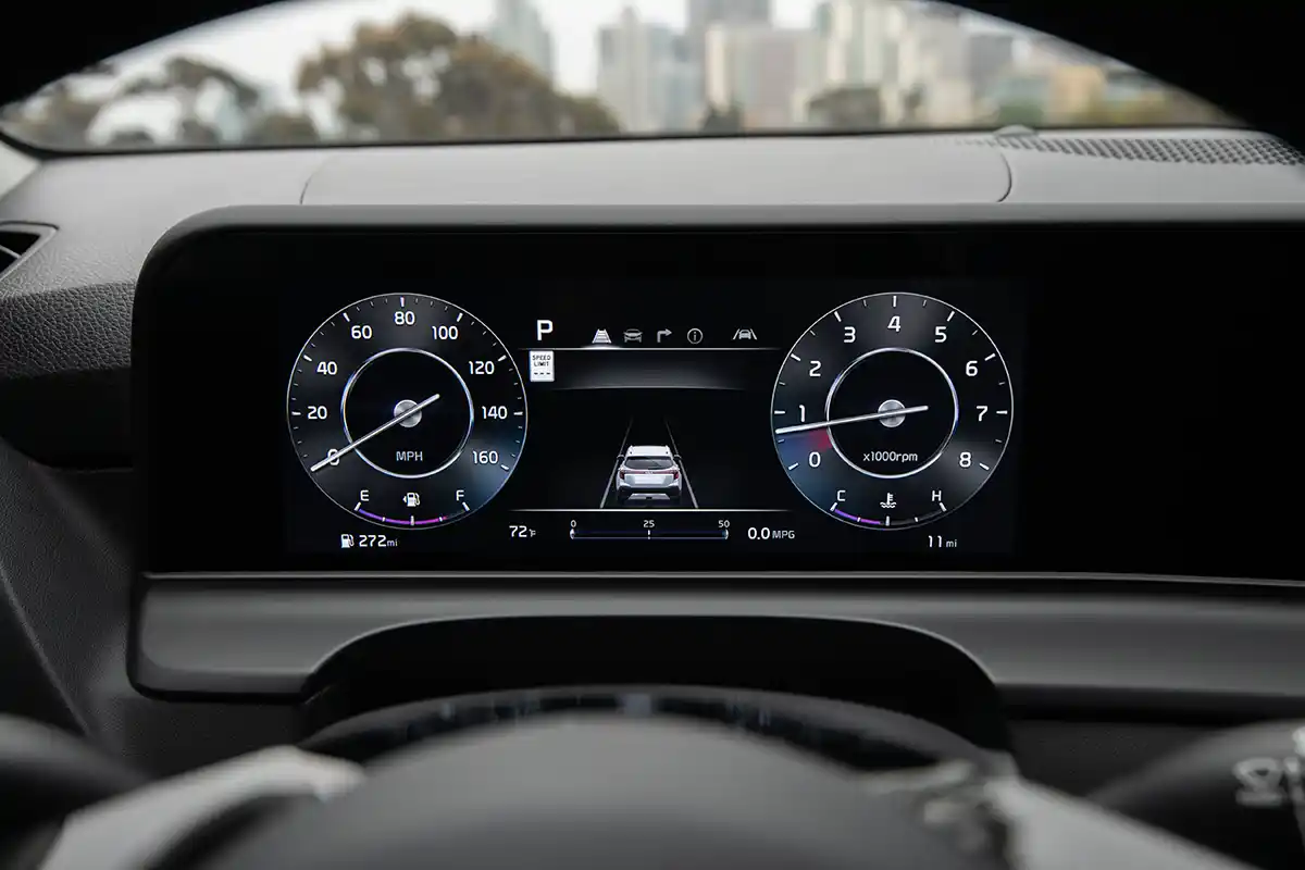The Seltos’ interior space gives off a futuristic vibe with bright screens and clean, geometric shapes: