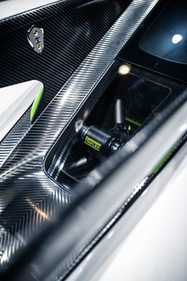The body is fitted with Koenigsegg’s Autoskin technology. Designed first for the Koenigsegg Regera, Autoskin uses electronics and minituarised hydraulics to automate the operation of doors and hoods. Drivers can open either of the passenger doors or the front/rear hoods at the touch of a button on the Koenigsegg remote key. The hydraulics used for Autoskin were already designed into the car to operate active aerodynamics and chassis levelling systems. This use of existing systems to provide new features is a prime example of Koenigsegg design philosophy.