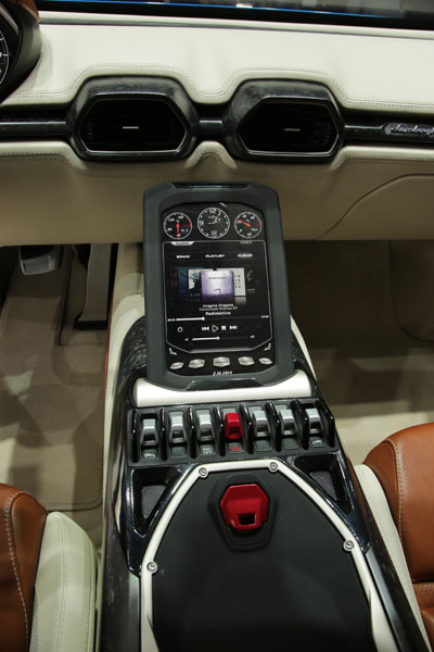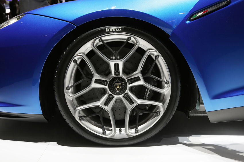 The front air intakes are characterized by an active air cooling system which uses a double layered grid for the first time in a Lamborghini: one metal and one titanium grid are embedded into each other, one containing the Y leitmotiv and the other the hexagon theme, creating a tri dimensional effect and standing out against the body colour.