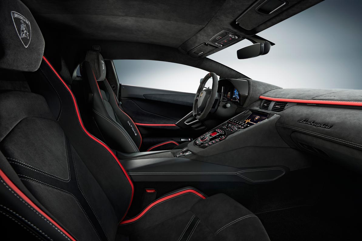 The driver and passenger environment is just as refined: the customizable TFT digital dashboard displays driver modes as well as controlling in-car connectivity. Apple CarPlay manages voice activated communications and entertainment, with the Lamborghini telemetry system available as an option for those wanting to celebrate the last Aventador on track.