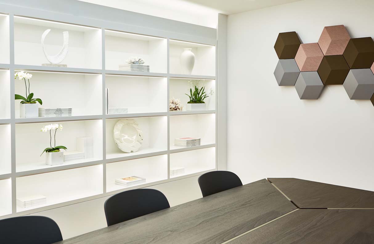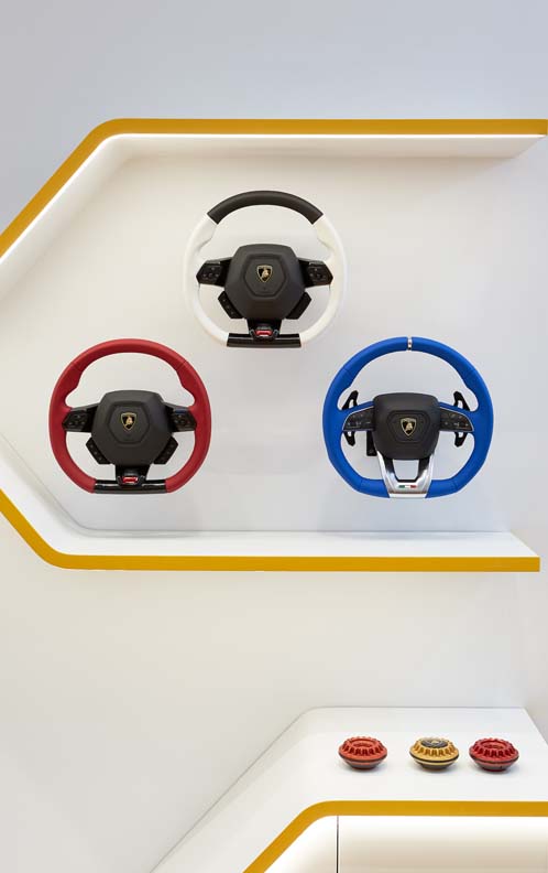 Trademark Italian furnishings from Living Divani garnish each room. As members of Altagamma, the foundation that gathers Italian companies with international recognition and operating at the highest segment of the market as it pertains to innovation, quality, service, Living Divani and Automobili Lamborghini combine their iconic products in a convincing and inspirational look, making for a true Made in Italy experience. The layout of the space includes the modular Extrasoft sofa as well as the latest novelties from the brand, mixed with Lamborghini’s design ethos and super sports cars.