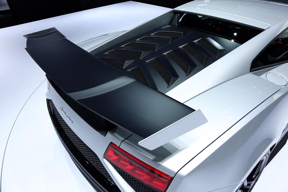 The new Gallardo Squadra Corse is derived directly from the race car. Both share the same V10 engine, which is used in the racing version with no modifications. Likewise, the Squadra Corse has the same rear wing for greater aerodynamic load – achieving, under the best aerodynamic conditions, three times the load of the Gallardo LP 560-4 – for increased dynamic stability during tight high-speed cornering. Another element taken directly from the racing version is the removable engine hood equipped with a quick-release system. Both the rear wing and the hood are made from carbon composite material, as are a host of other components on the Squadra Corse.