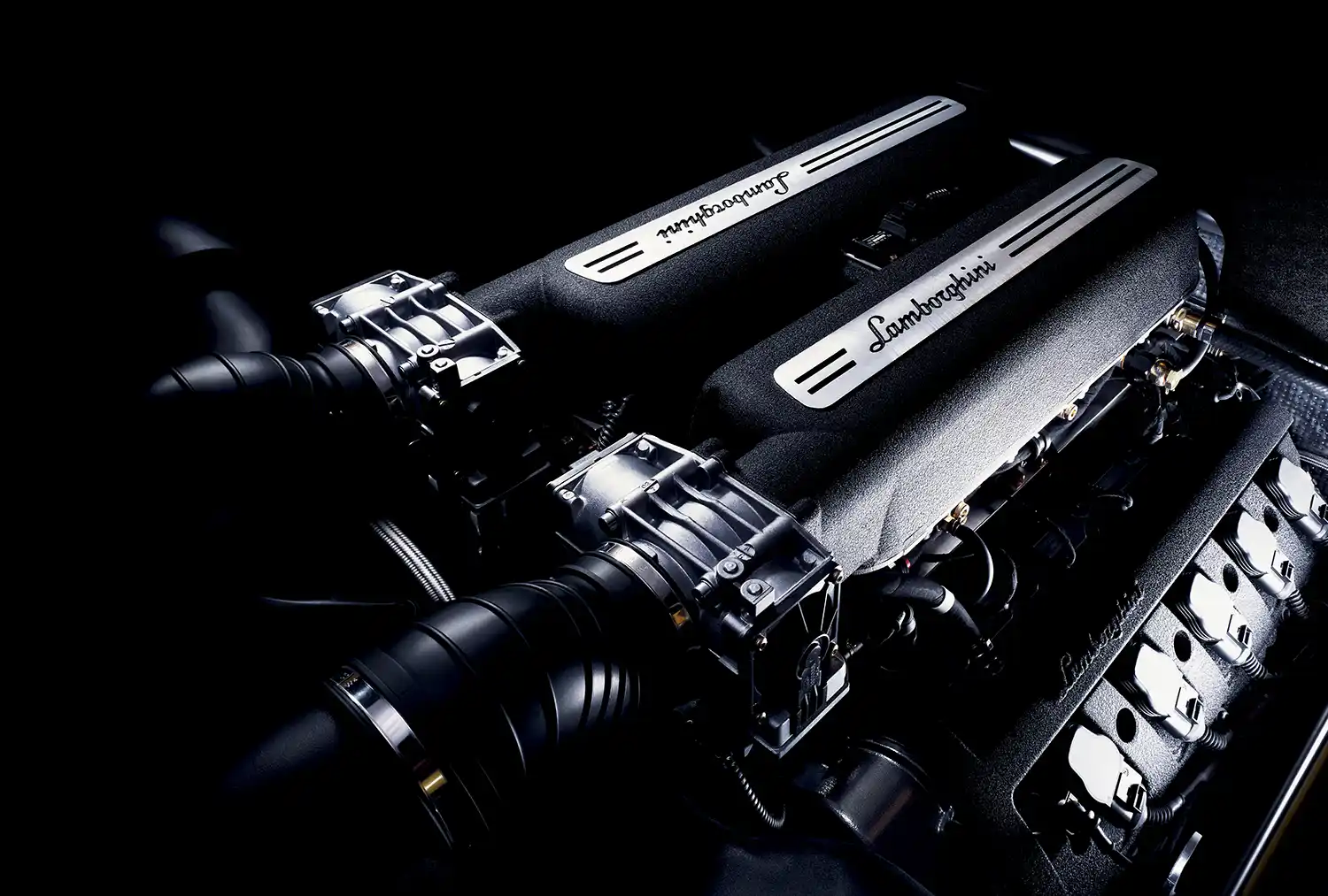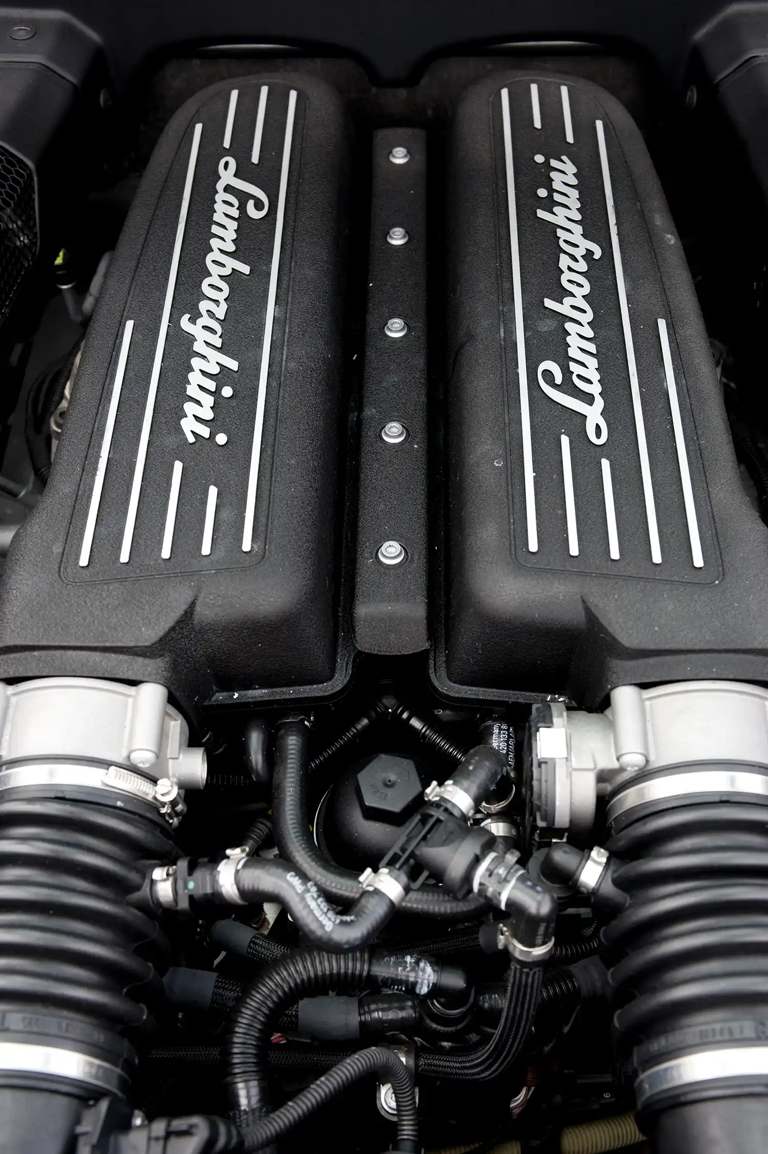 The engine installed on the first Gallardo was a 5-liter, 10-cylinder V90 DOHC with 4 valves, delivering 500 HP. Instead of the classic choice of a V72, a 90-degree angle was favored to limit the of the engine, thus gaining advantages in the layout of the vehicle (ie lower engine hood and better rear visibility) and lowering the center of gravity for improved dynamics. Regular firing intervals (ensuring engine smoothness) were achieved through the adoption of “crankpins” with an 18 degree offset. A dry-sump lubrication system not only resulted in perfect lubrication even under extreme dynamic conditions, but also enabled a further lowering of the center of gravity.