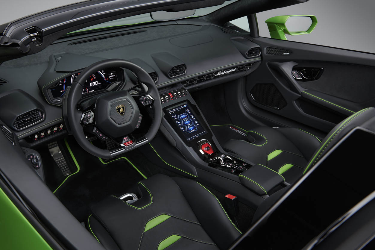 The Lamborghini Huracán EVO Spyder is presented in Verde Selvans: an iconic new Lamborghini four-layer green, and one of an enhanced range of colors and trims available for the Huracán EVO coupé and Spyder. Interior options include new EVO trim in Alcantara and leather mix, with stitching and trim details to match the body tone. A number of style packages are offered as well as lightweight materials such as Carbon Forged Composite and Lamborghini’s patented Carbon Skin. Lamborghini’s comprehensive customization program, Ad Personam, allows virtually limitless personalization of the new car. The EVO Spyder sports the new 20″ Aesir rims, with Pirelli P Zero tires.