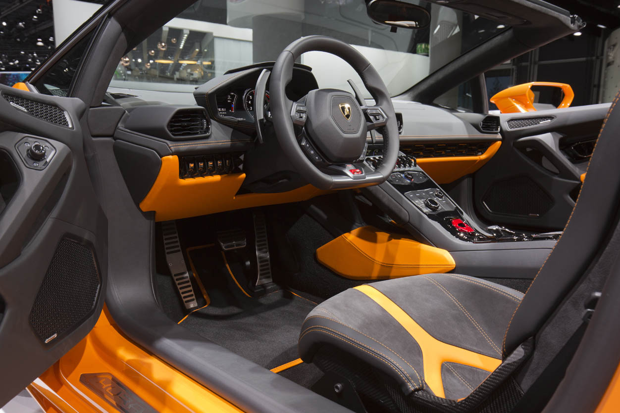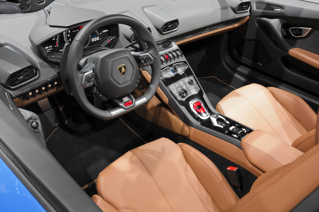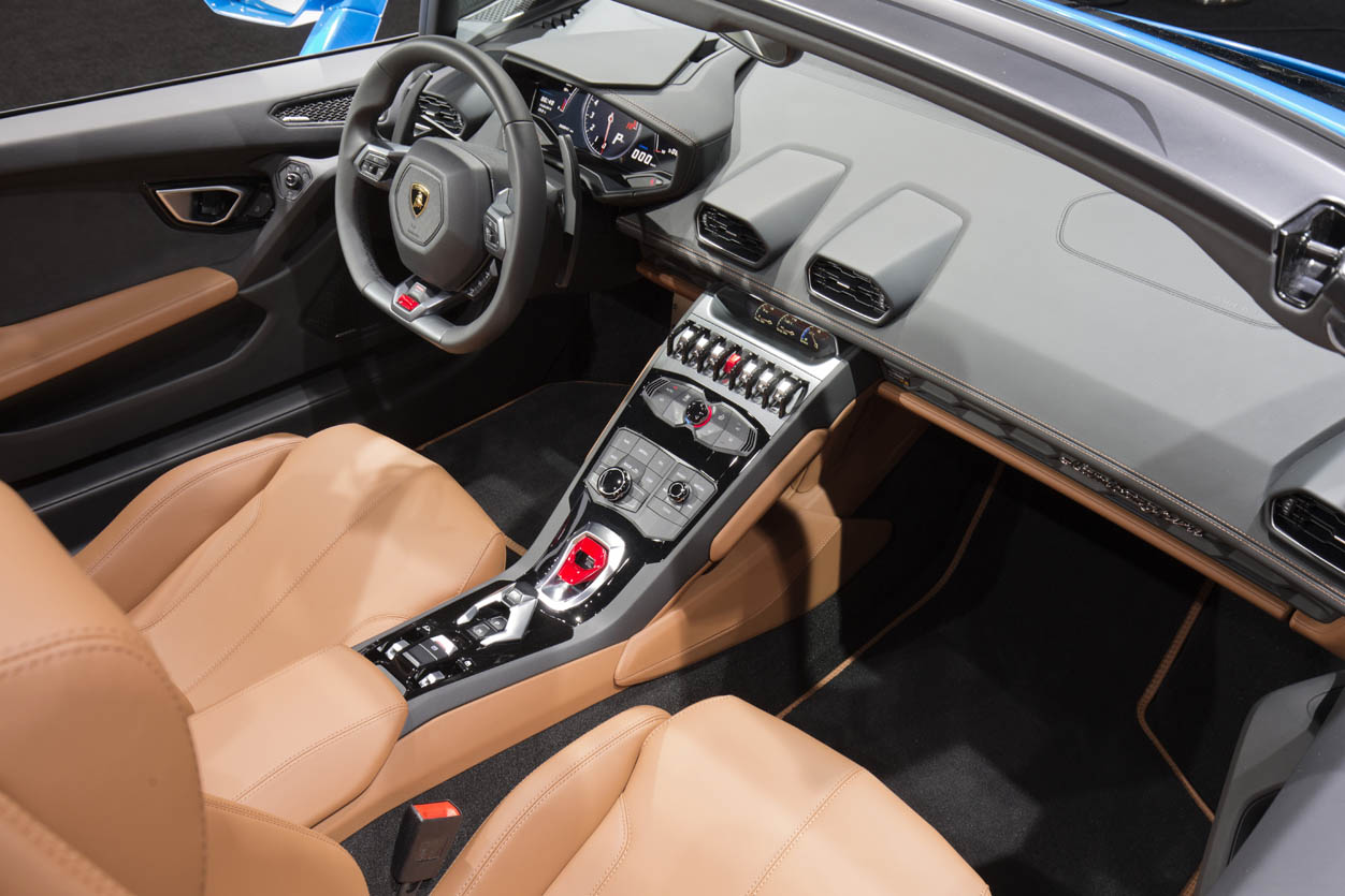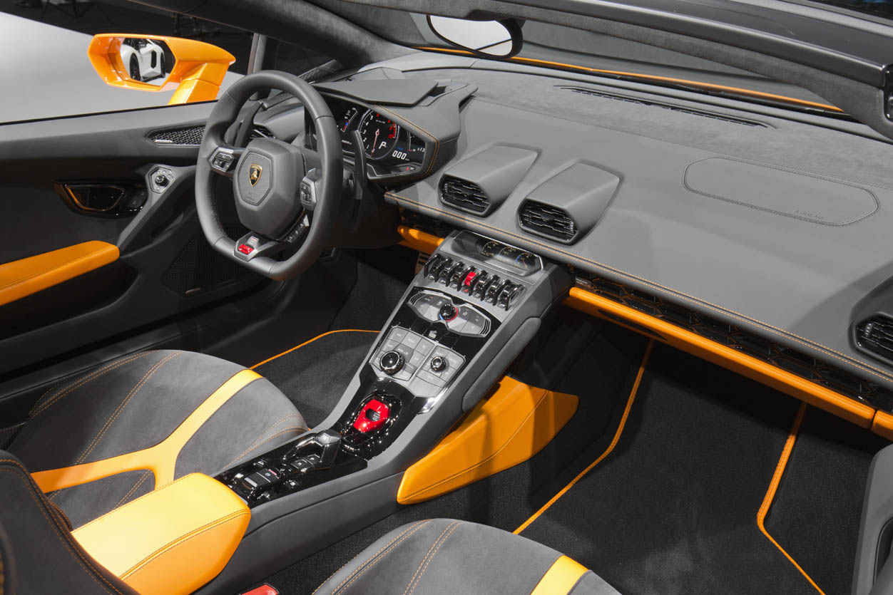 The driver can control the display functions via the buttons on the steering wheel: the only other operating elements are the shift paddles. The buttons for the soft top and the rear windshield are on the center-tunnel console as is the start button for the V10 engine, located beneath a red cover as in a military jet. The electric seats of the Huracan Spyder are equipped with an ECU that ensures all movements are made without engine wall contact.
