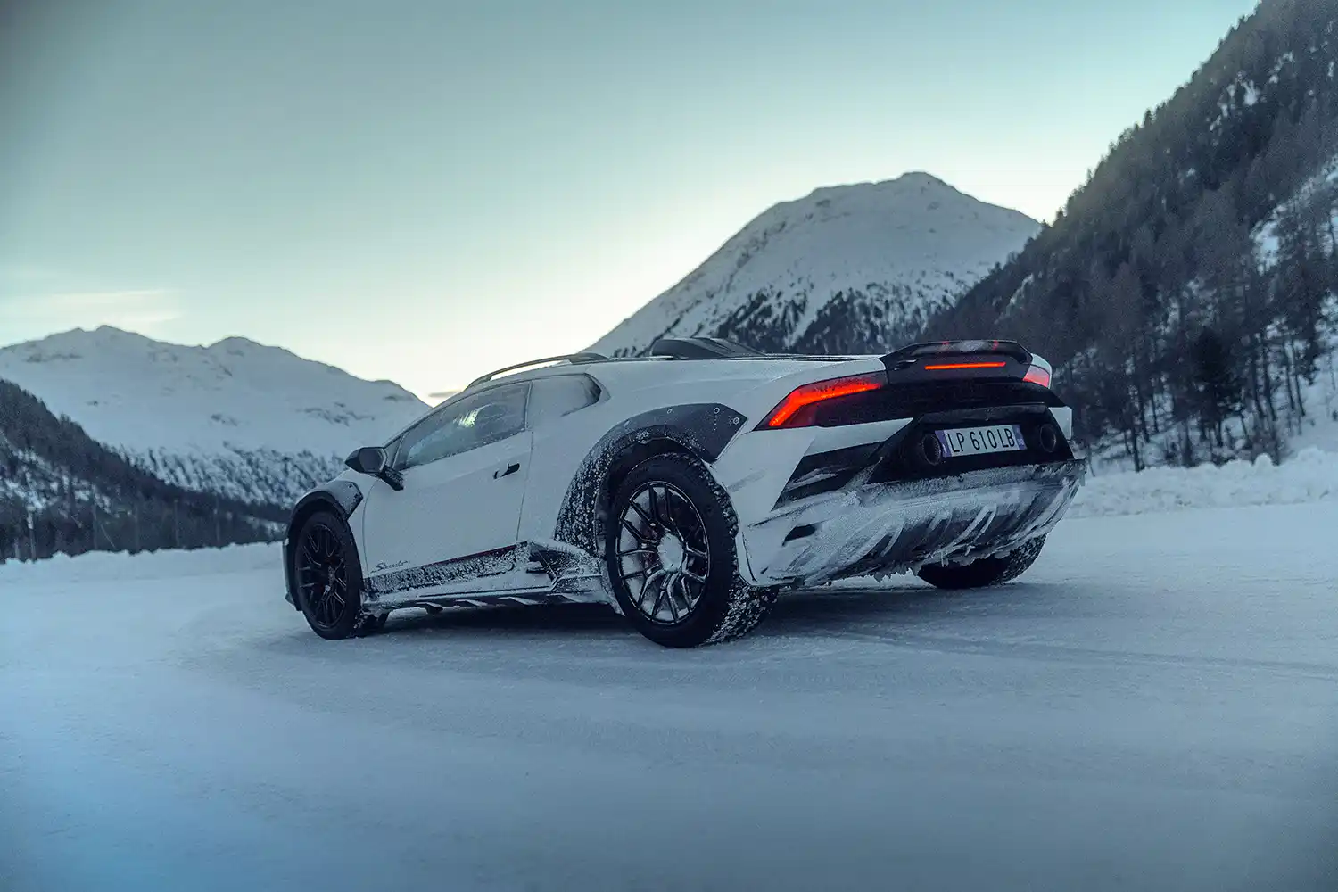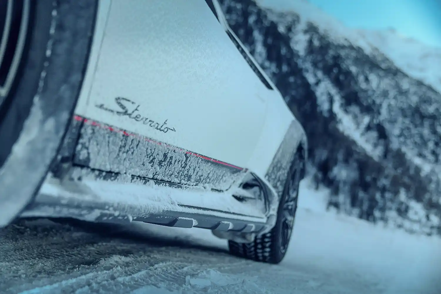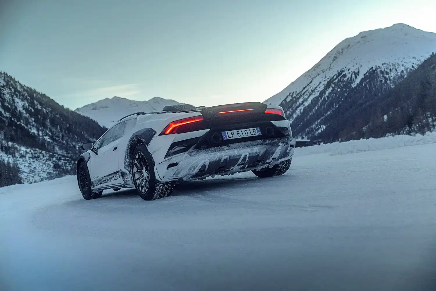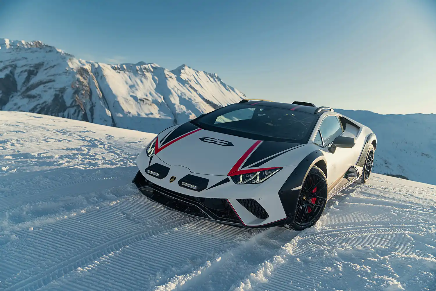 The Huracán Sterrato[1] arrived in an exclusive ski resort in the Italian Alps, proving its prowess on snow and ice. Switching from road-driving modes to its special ‘rally’ option, the set-up of the permanent four-wheel drive Huracán Sterrato conquered the low-grip surfaces of the winter destination with a dynamic flourish.