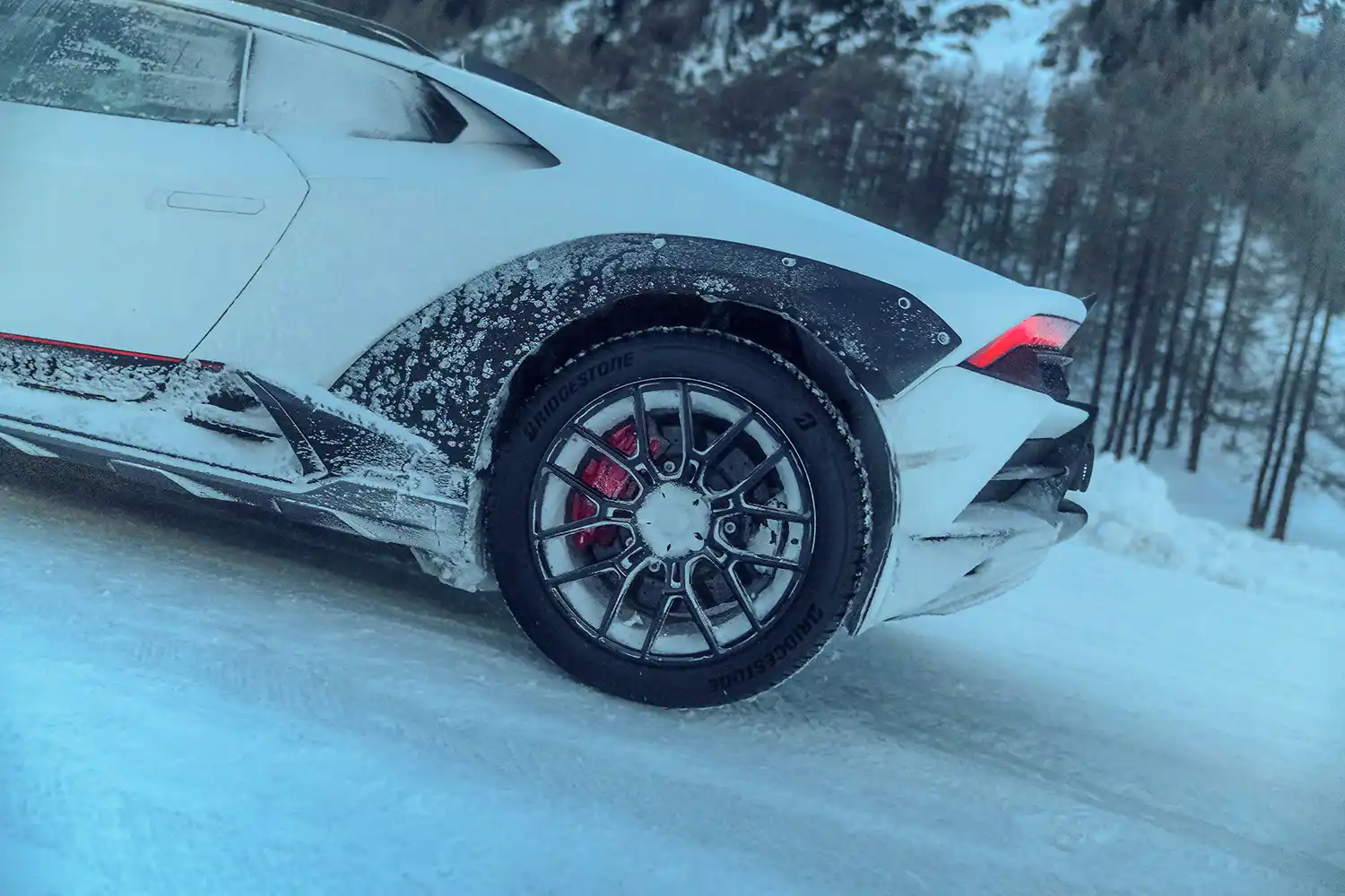 The revised LDVI system (Lamborghini Integrated Vehicle Dynamics) of the Huracán Sterrato delivers specifically-calibrated STRADA and SPORT drive settings for road, with the new RALLY mode optimized for dirt and loose surfaces including snow: another facet of the super sports car’s fun-to-drive personality. Its wider tracks and increased ride made short shrift of the snowy setting, and the Sterrato’s Bridgestone Dueler AT002 run-flat tyres, specially-adapted for the all-terrain Huracán and rated for its top speed of 260 km/h, assured maximum performance in the wintery conditions. The aluminum front underbody, reinforced sills and rear diffuser, and enhanced wheel arches protected the Sterrato from icy obstacles, and emphasized its powerful muscularity in the challenging winter sports environment.