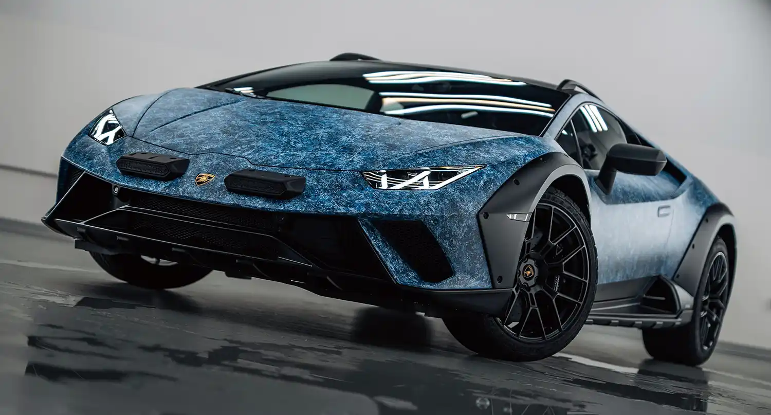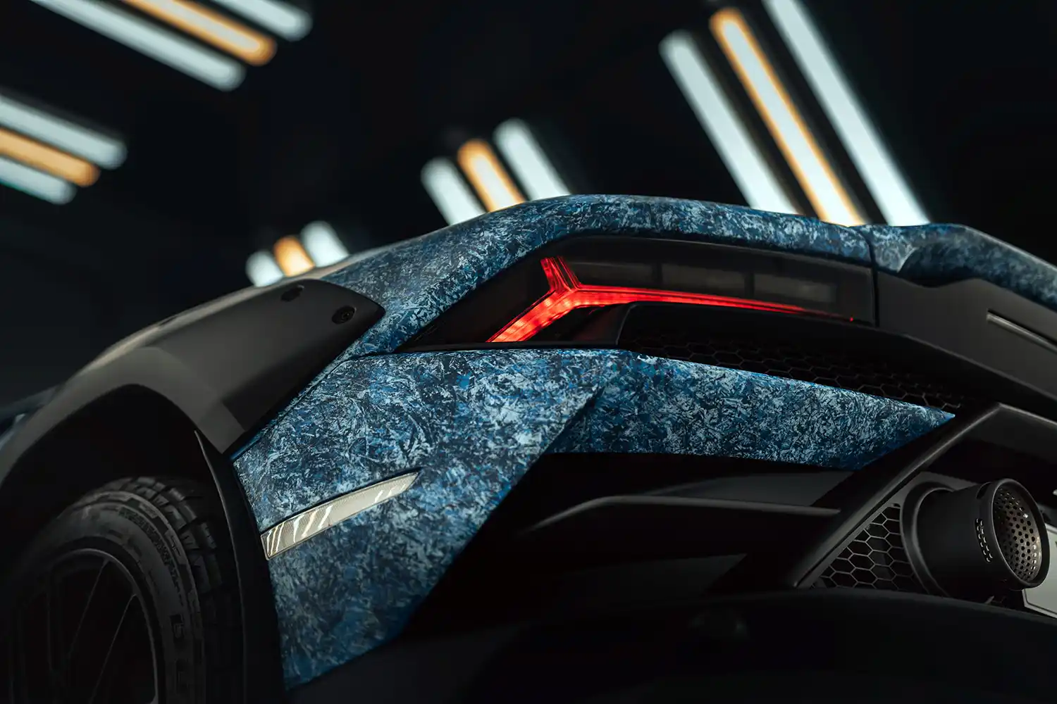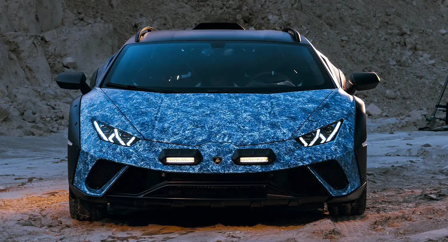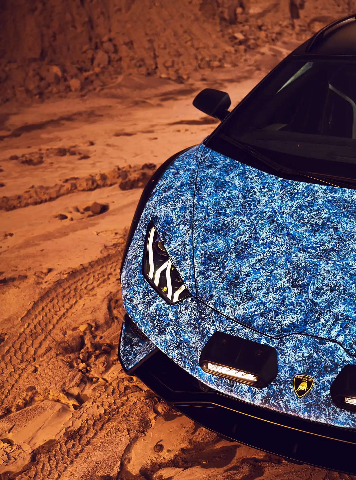 The Huracán Sterrato Opera Unica exudes the inimitable, brave character of the super sports car that perfectly tackles the paved and unpaved roads of the Costa Smeralda, while its unique, hand-painted exterior takes inspiration from the marine-blue landscapes and rich colors of Sardinia. The three-color hand-painted process creates the crystal effect of frozen liquid: Blu Amnis is used as the first solid paint color, and then etched into by hand with a second Blu Grifo paint and a third color Blu Fedra, in a process taking over 370 hours.
