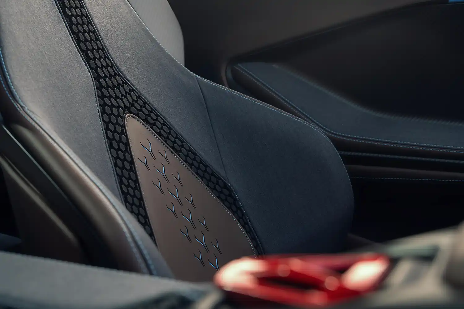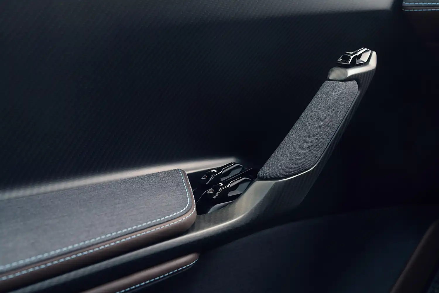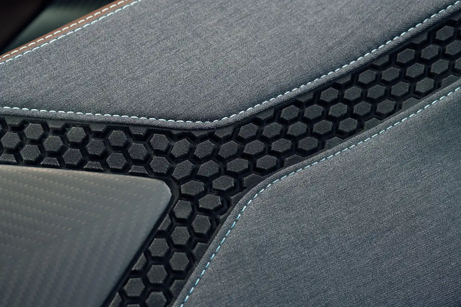 The interior is made almost entirely of sustainable materials, all made in Italy. While the high-end Merino wool (from a B Certified Italian company) dresses the dashboard, seats and door panels, the colored thread is made of recycled material regenerated nylon / recycled plastic and many non-visible plastics, such as the foam of the sports seats, are made of 3D-printed recycled fibers. Even the extensively integrated carbon, such as in the center console and door panels, is made of regenerated carbon: a new, two-layer composite material.