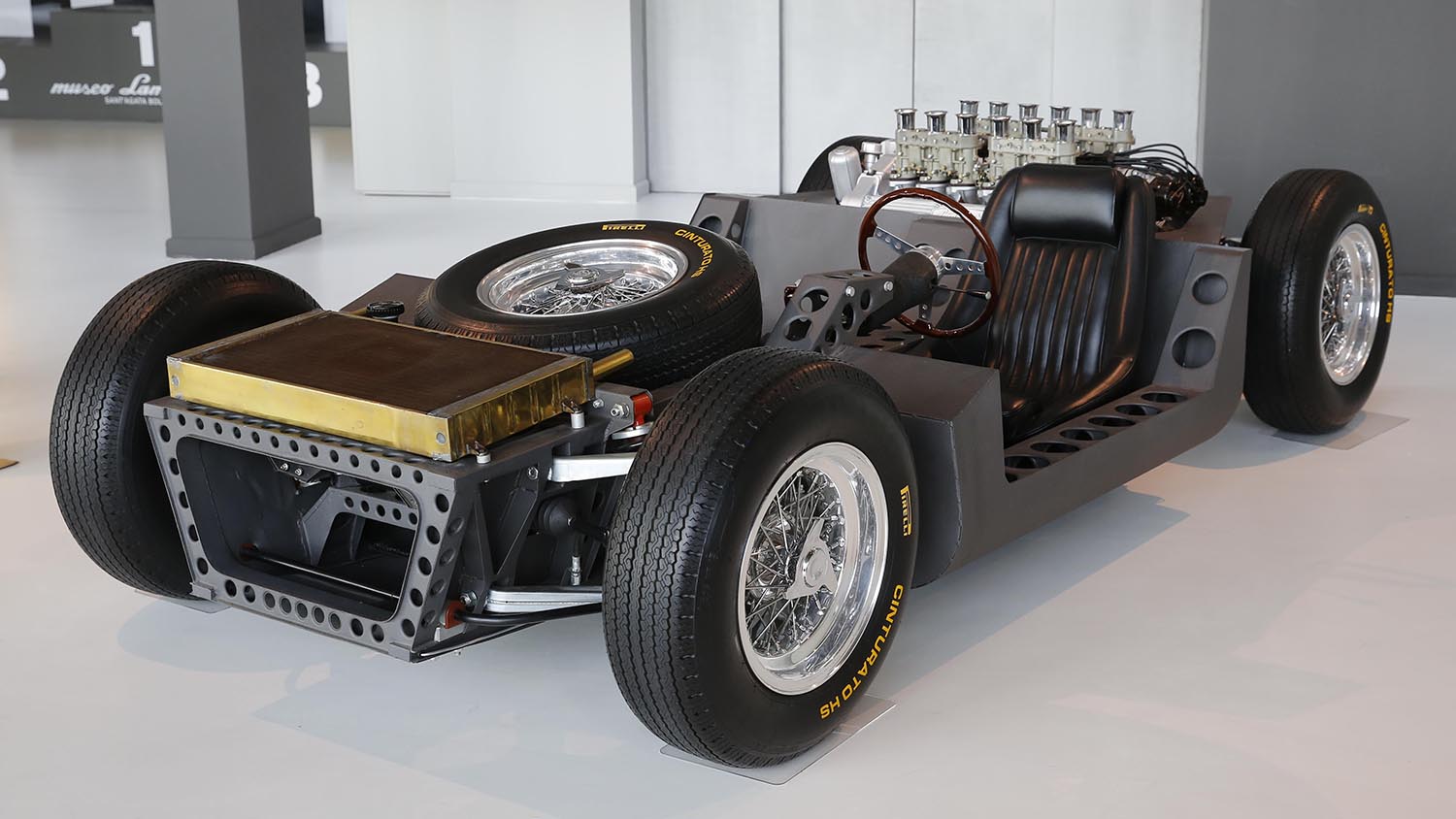 The structure itself was built by Marchesi of Modena. It used 0.8-millimetre steel sheet, folded and drilled strategically to ensure lightness and rigidity. The total weight did not exceed 120 kilograms, which was a remarkable result for the era. A central tub served as the load-bearing element. This tub was also the mounting base for the suspension components. Two auxiliary front and rear subframes supported all the mechanical components and accessories.