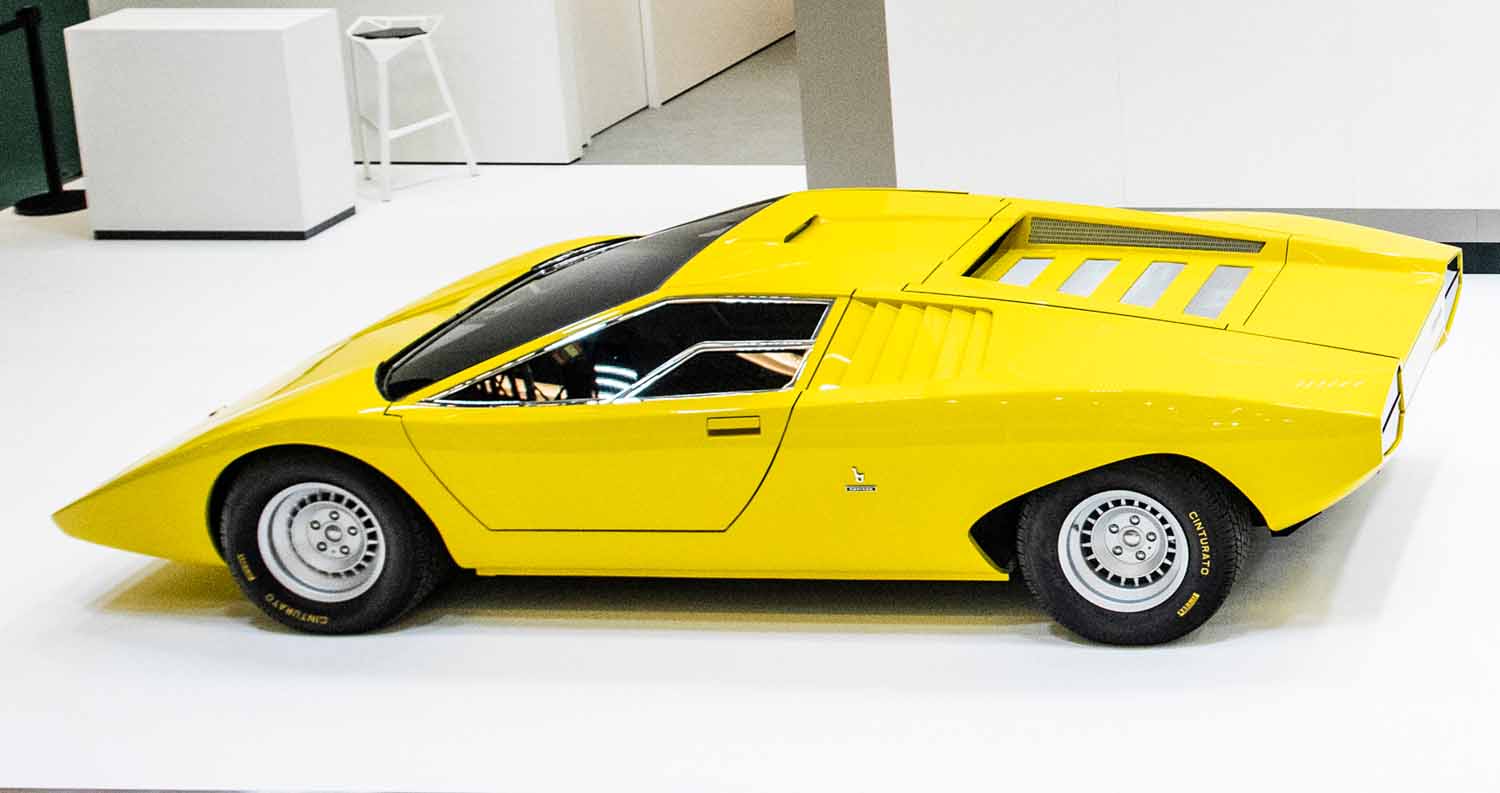 The Countach LP 500 is on display in its original “Giallo Fly Speciale” shade of yellow. It is a reconstruction of the legendary car that was presented in March 1971 at Geneva Motor Show and destroyed in a crash test carried out for type approval purposes in March 1974. The reconstruction work was carried out by Lamborghini Polo Storico for a collector, taking approximately 25,000 hours. A crucial contribution was made by Lamborghini’s Centro Stile, which oversaw the outlining of the bodywork and ensured that everything matched the original style. The mechanical components are all either restored components from the era or reconstructions of parts that are no longer available or were made specifically for the car. The bodywork and chassis were entirely rebuilt by expert panel beaters, who shaped and beat them by hand. Pirelli came on board to remake the tires. Through its Foundation, it provided all of the historic materials required, produced tires whose design and dimensions were in keeping with those from the period, and had them approved for road use.