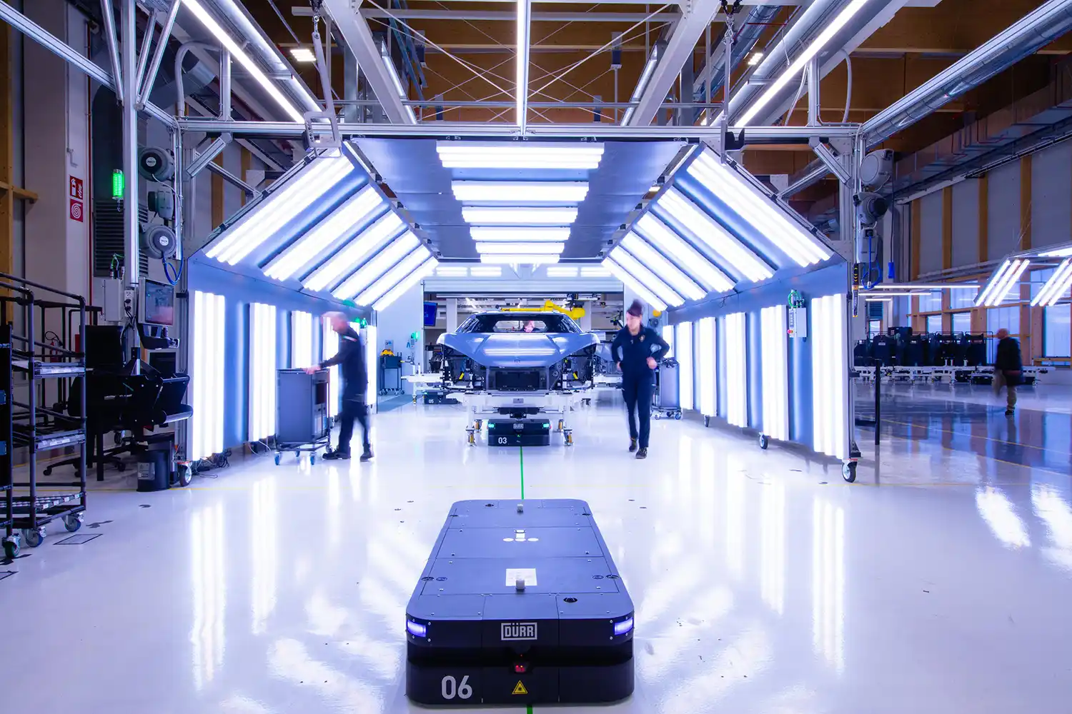 Another innovation is the presence of Automated Guided Vehicles (AGVs), handling devices that at some of the stations transport, in a collaborative mode, certain materials used to assemble the car.