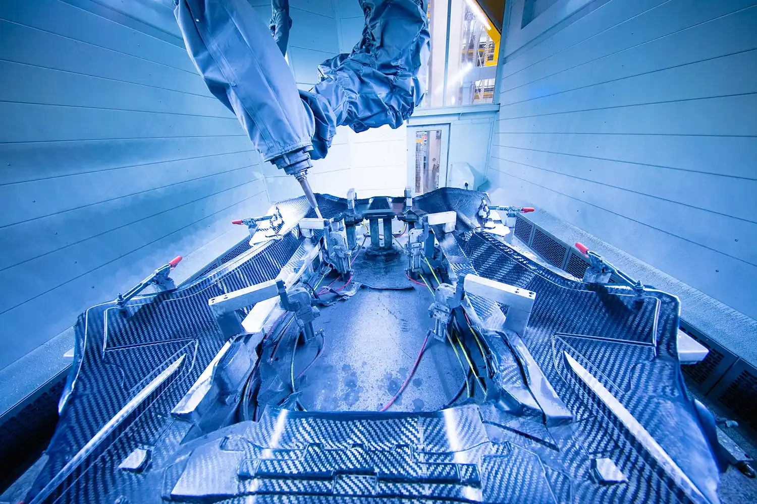 The real protagonist of the Revuelto is carbon fiber, produced using both handcrafted and automated processes in Lamborghini’s CFK plant in Sant’Agata Bolognese. It is the main structural element of the new car, used to make not only the monofuselage chassis but also a significant part of the body elements. The extensive use of carbon fiber and other ultralight materials, combined with the powertrain’s outstanding performance numbers, has led to the best power-to-weight ratio in Lamborghini history: 1.75 kg/CV. One of the main innovations of this car is that the tub is made in one piece via the total industrialization of the process called Lamborghini Forged Technology. For the Revuelto, the value of carbon fiber processing is so high that it prompted Lamborghini to expand and upgrade the CFK plant, which now covers 16,200 square meters. In this plant as well, the operators have priority over all the processes, though they are still partly handled by machines. Currently, between CFK and assembly, some 500 production operators are dedicated to the Revuelto.