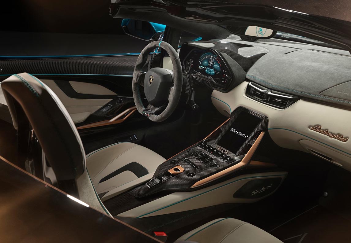 Encapsulating the blue of the sky and the green of the fields, evoking the freedom and driving elation delivered by the open top Sián Roadster’s performance, the car is finished with Oro Electrum wheels: the color chosen by Lamborghini to signify electrification.