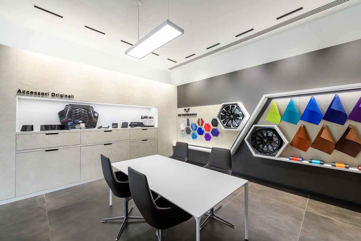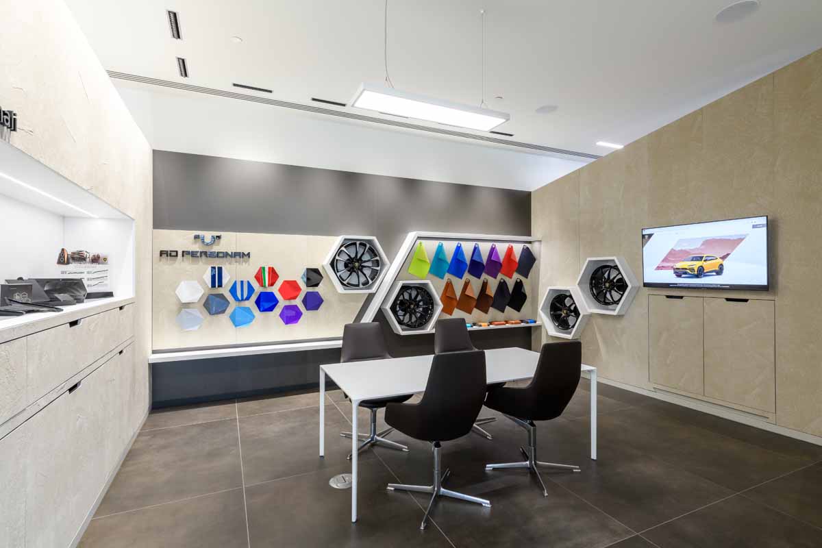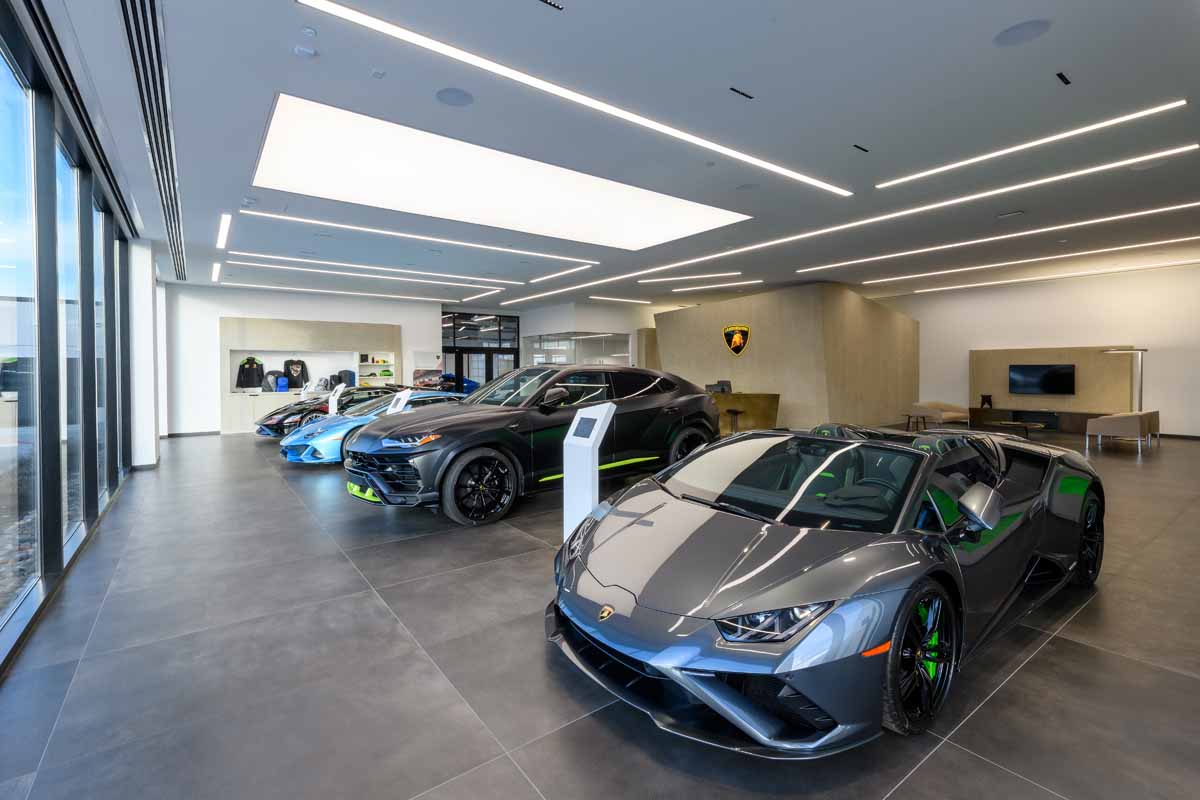 Clean lines, hexagonal shapes and a diffusion of light and color are used throughout this 15,875 square-foot facility. Customers can expect to see the full lineup of Lamborghini models displayed on the showroom floor, including the Urus Super SUV, race-inspired V10 Huracán STO and limited-production V12 Aventador Ultimae.