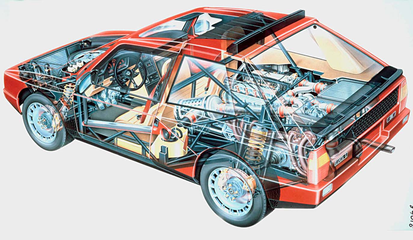 The Stradale’s chassis was a space frame, similar to its rally counterpart, built out of CrMo steel tubes and aluminium alloy for the crash structures; it was covered by epoxy and fiberglass body panels. Like the rally car, the 1.8-litre four-cylinder engine was longitudinally mid-mounted, equipped with Weber-Marelli IAW integrated electronic ignition and fuel injection, a supercharger, a turbocharger and two intercoolers. In road tune the 1.8 produced 250 PS (184 kW; 247 hp) at 6750 rpm and 291 N⋅m (215 lb⋅ft) of torque at 4500 rpm. The “Stradale” kept a three differential four-wheel-drive system from the rally car; the centre differential sent 30% of the engine torque to the front open differential, and 70% to the rear limited slip.