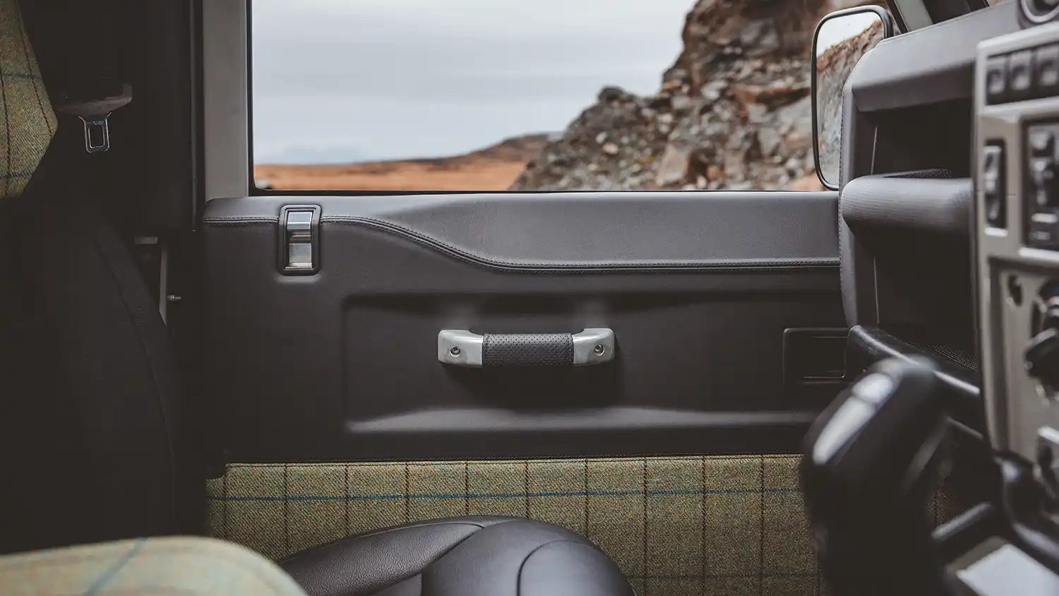 The links to the Isle of Islay are weaved into the thoughtful details found throughout the interior. The shoulder area of the seats, sections of the door cards, the lid of the central armrest and detail hidden behind the sun visor are all finished in a tactile specially chosen tweed, crafted by the Islay Woollen Mill – providing a unique connection to the location and its place in Defender’s history.