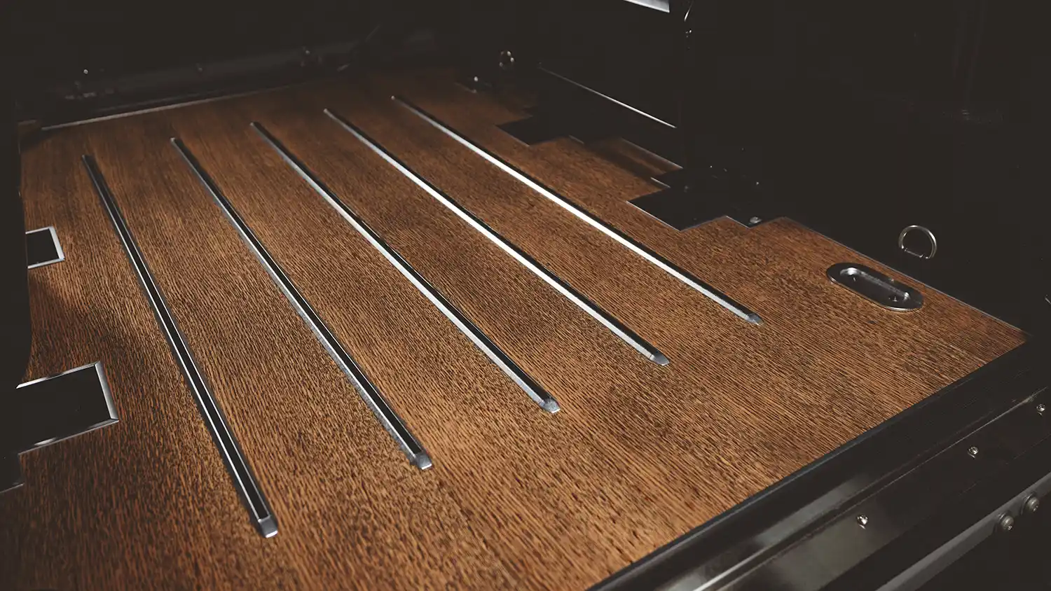 Oak wood veneer detailing extends to the rear loadspace floor, and the beautifully finished and durable feature meets the same rigorous quality and engineering standards as those used on the latest production Range Rovers. The clock on the centre of the dashboard also mirrors the wood grain of the other features.