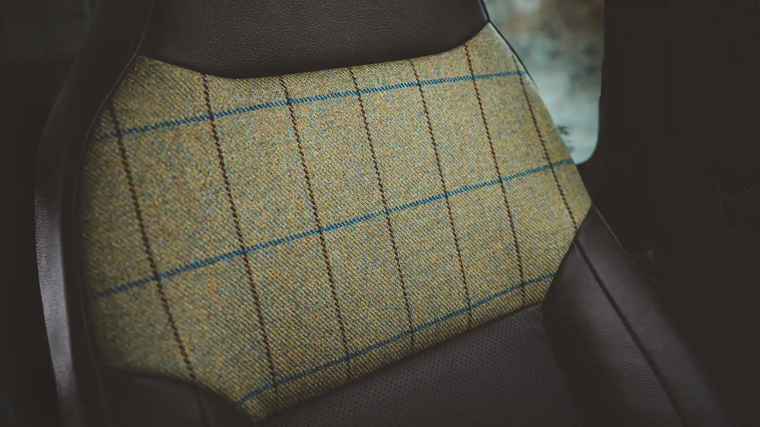 The pattern of the tweed features an earthy base that echoes the local landscape. Land Rover Classic chose colours to represent the area, with blue for the sea and the sky of Islay, purple to reference the local heather, and a subtle yellow chosen to reference the peaty grassy landscape. The special fabric also features on a unique pouch in the centre cubby, for stowing small items such as a smartphone.