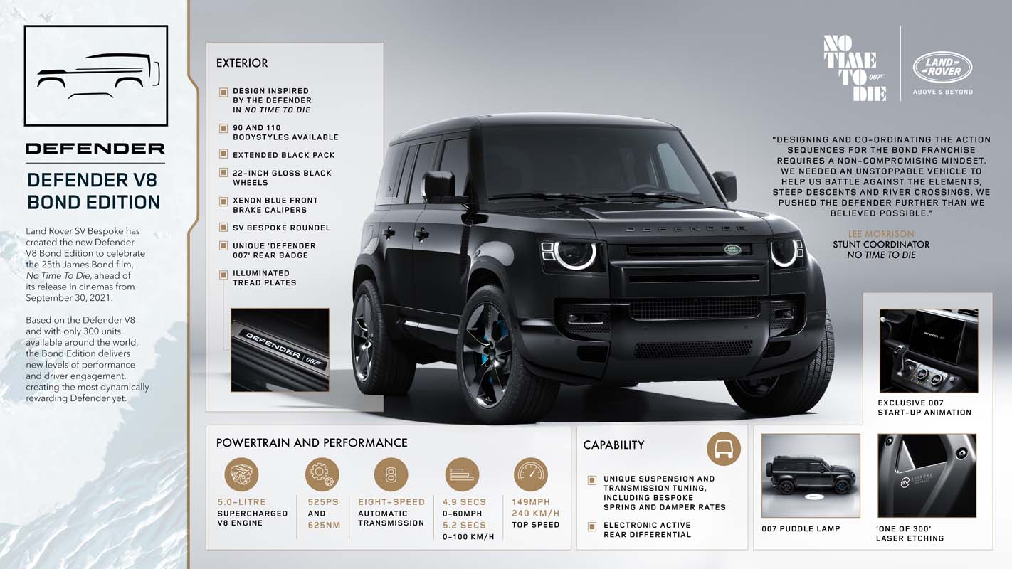 and Rover SV Bespoke has created a new Land Rover Defender V8 Bond Edition to celebrate the 25th James Bond film, No Time To Die, ahead of its world premiere later this month.