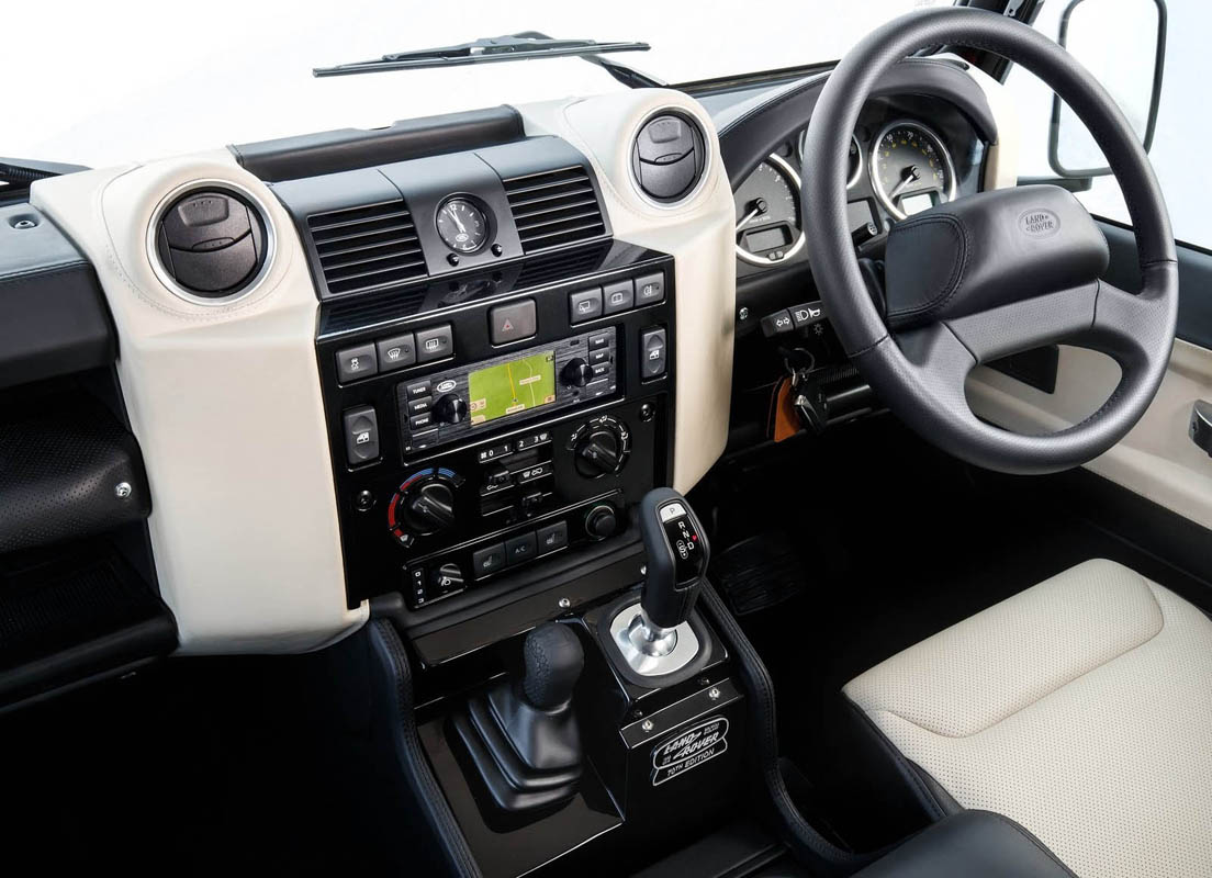 Eight standard body colours include two satin finishes – contrasting with a Santorini Black roof, wheel arches and front grille – finished with machined aluminium door handles, fuel filler cap and Defender bonnet lettering. A comprehensive lighting upgrade includes bi-LED headlamps.