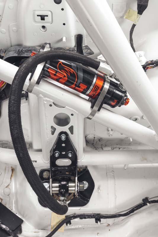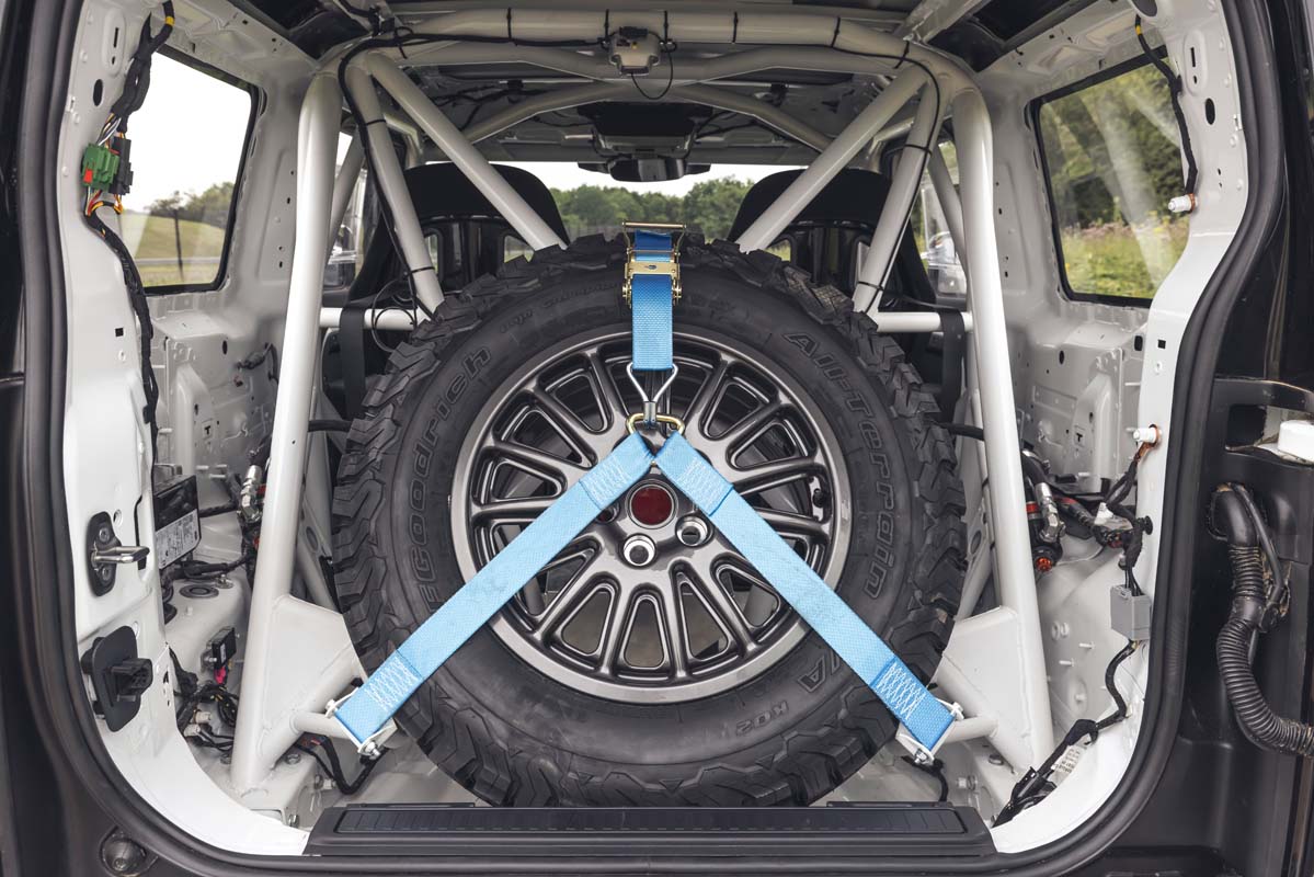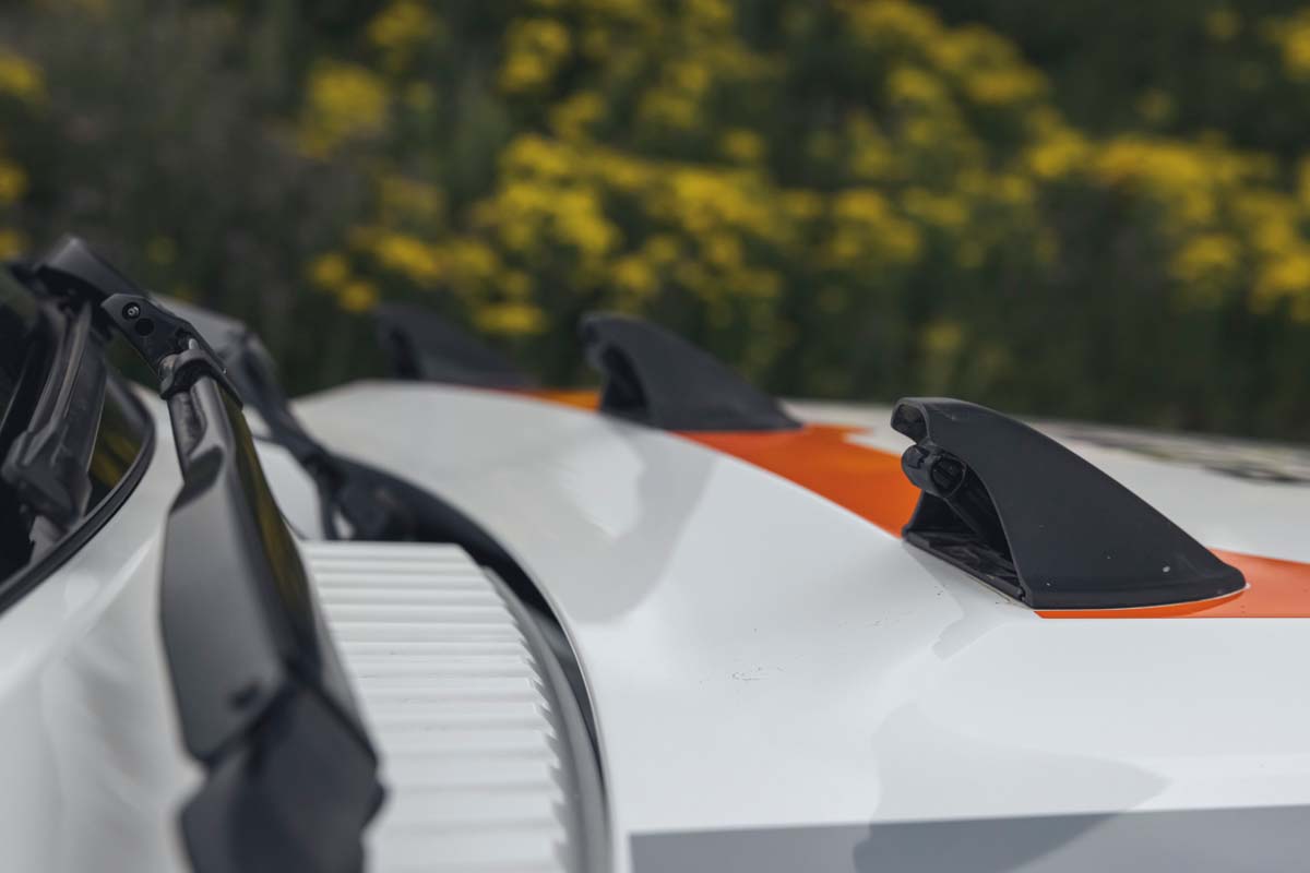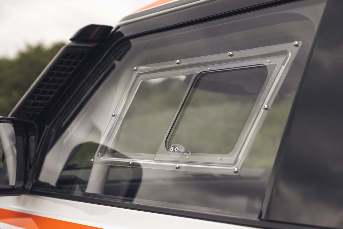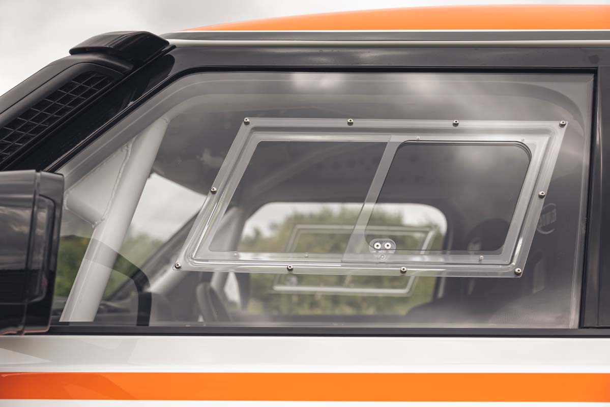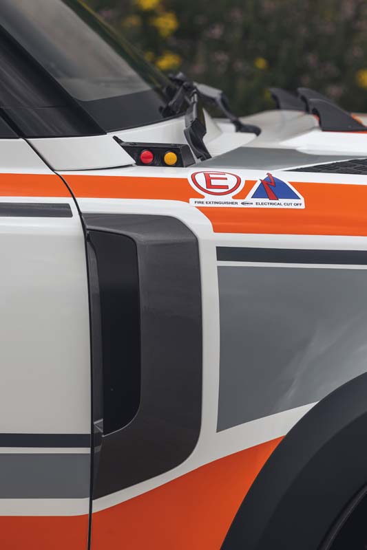 The standard doors are trimmed to remove the sill covering section, which allows the fitment of full-length, side-to-side underbody protection panels. A modified front end increases airflow to the cooling system and houses additional race-level lighting, while a new roof spoiler houses additional rear lighting.