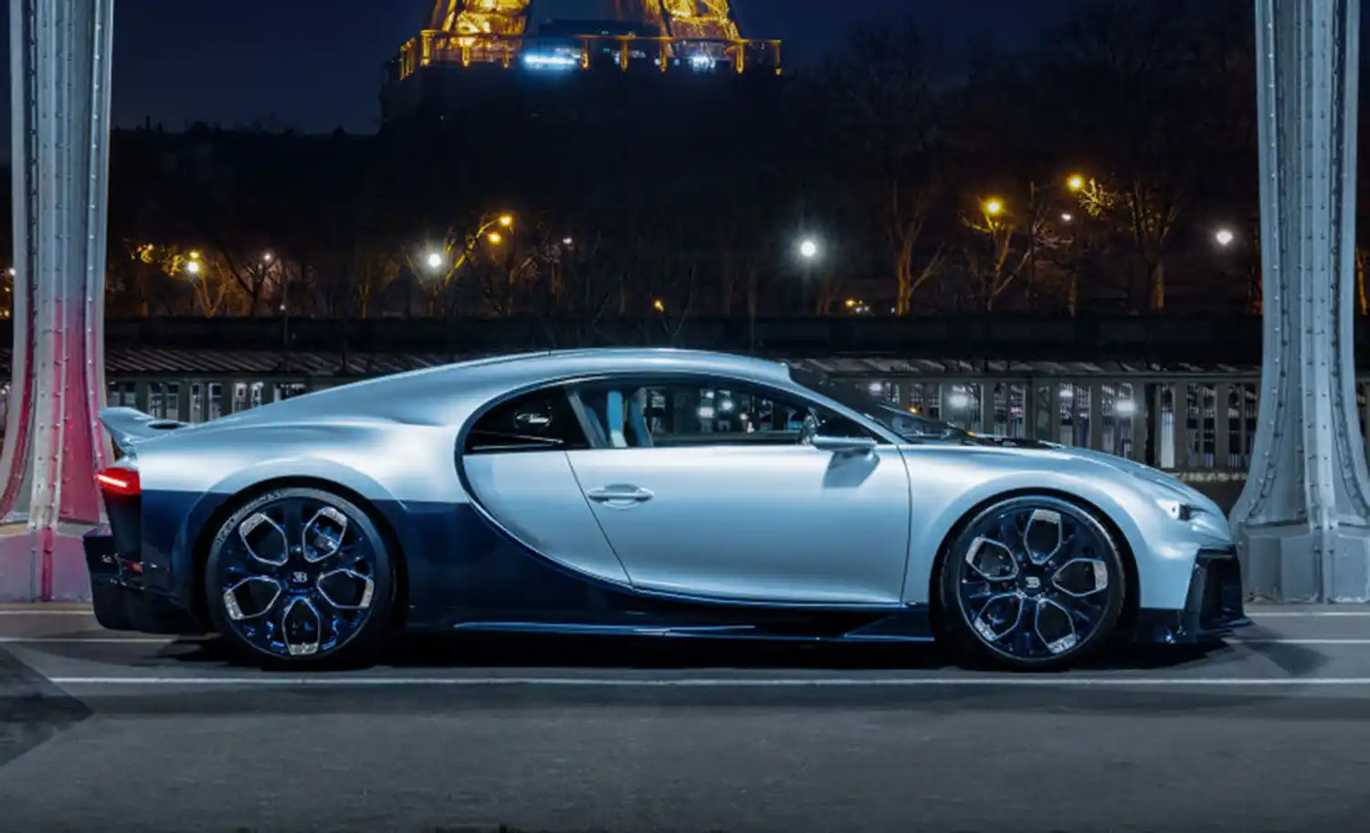 The Profilée is absolutely unique. Only one exists, and there will never be another. It features a rich, hand-crafted interior with woven leather as well as bespoke aerodynamic developments – including the only sweeping fixed tail in Bugatti’s modern history – and wheels developed specifically for this model. Befitting the Profilée’s status as an automotive solitaire, Bugatti’s designers created a very specific paint color exclusively for this car: Argent Atlantique. To complement this exquisite finish, a Bleu Royal Carbon tint was applied to the exposed carbon fiber of the car’s lower section as an homage to Bugatti’s distinctive duo-tone pattern. Other details which can only be found on the Profilée include a tailor-made wheel design inspired by the Bugatti famous horseshoe grille.