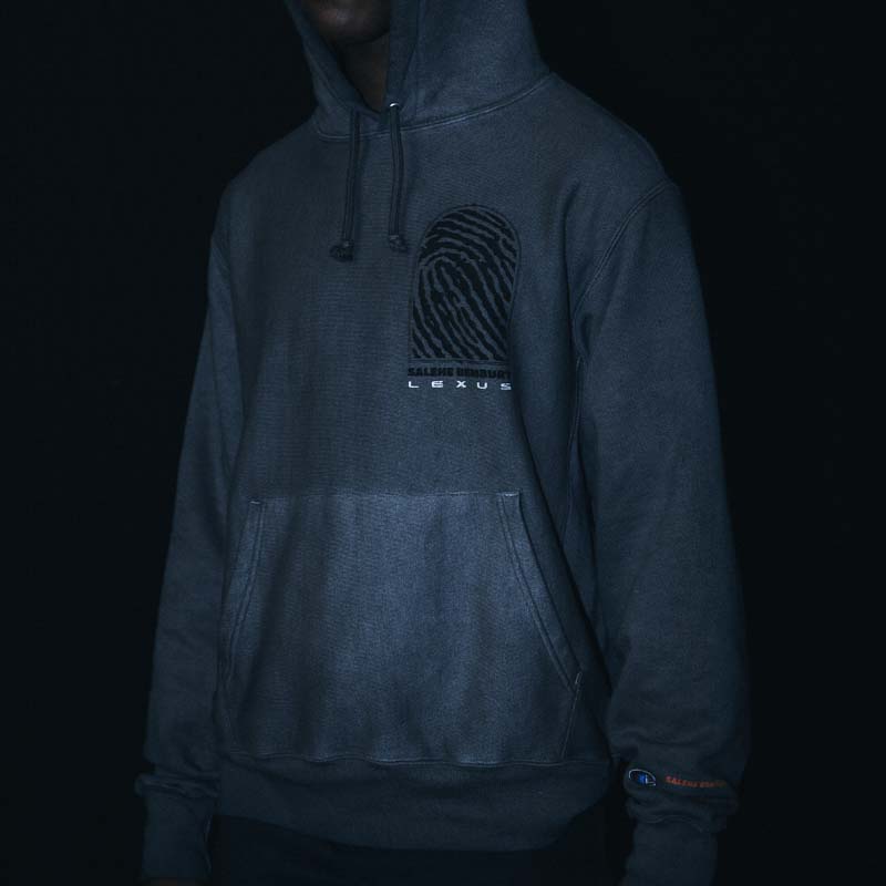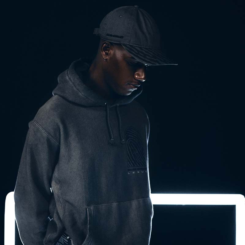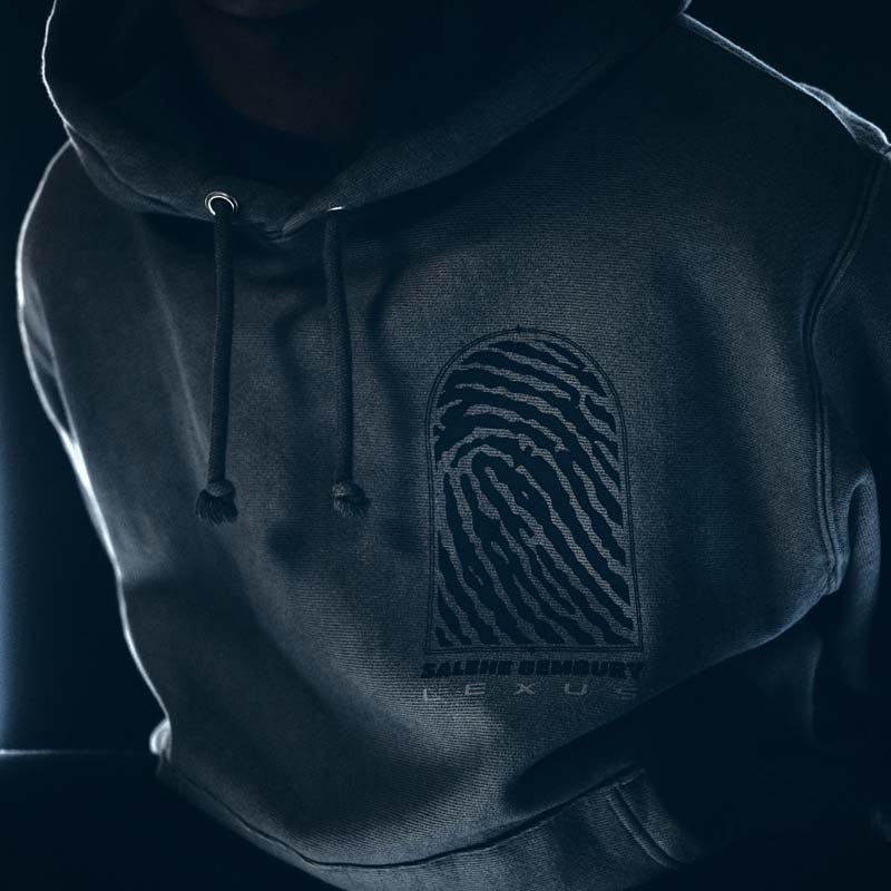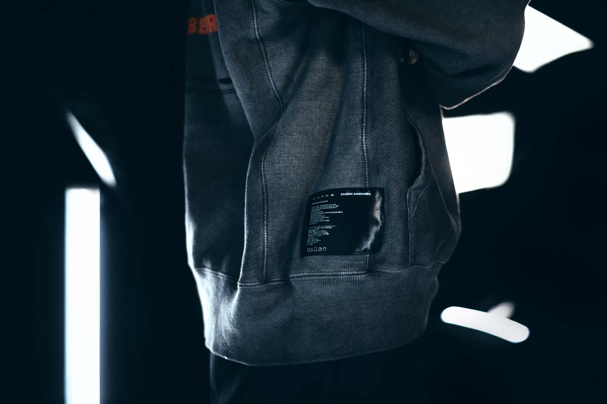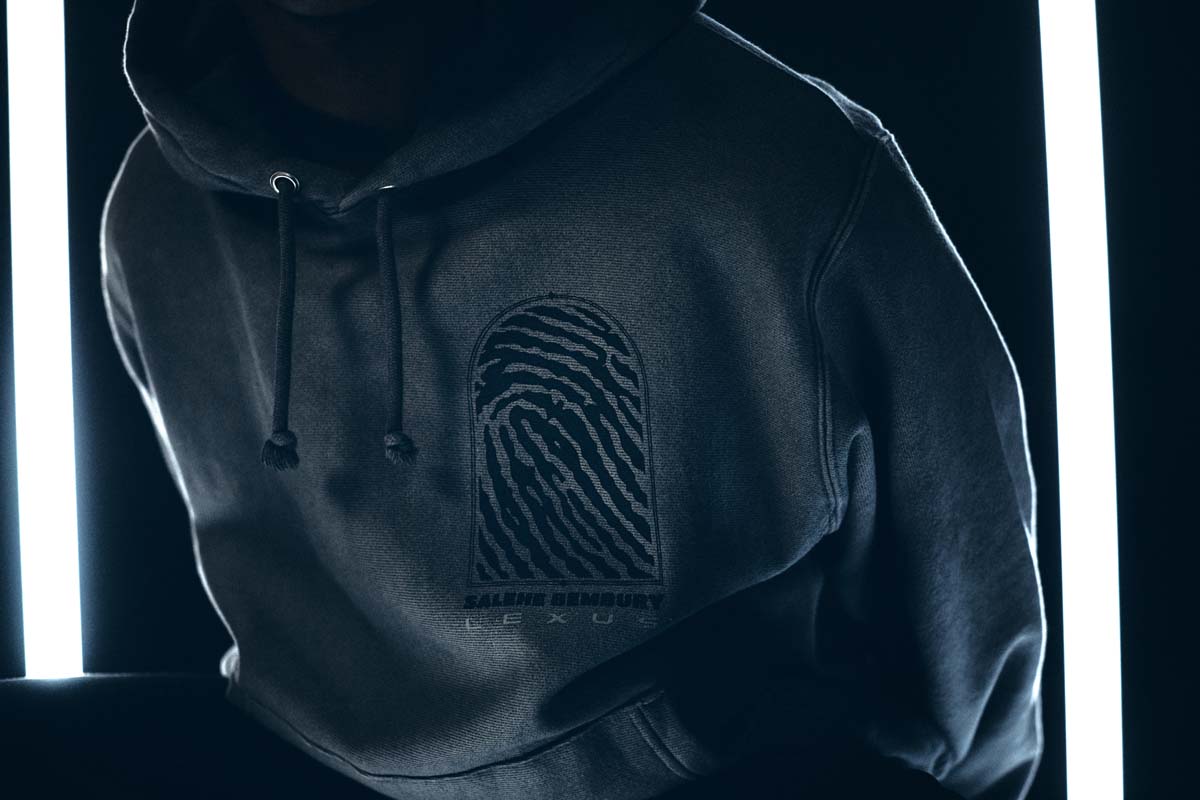 Lexus and Bembury identified Champion Reverse Weave as the best apparel silhouette for storytelling and took a deliberate approach with details that would amplify the collection’s narrative. For example, incorporation of reflective ink represents the idea of electrification and is used on both the T-shirt and hoodie. The fabric is dyed dark grey through a custom oil wash process, giving a unique look to the Champion apparel. Colors are drawn from the Lexus NX exterior options and the incorporation of a hand-finished, wash tag appliqué in both English and Japanese at the front hem ties together all of the brands working on the project. The focal point of the unstructured baseball cap is Salehe’s fingerprint logo wrapping the brim. In addition, embroidered Salehe, Lexus and Champion logos complete the piece, which is adjustable using a strap and metal buckle.