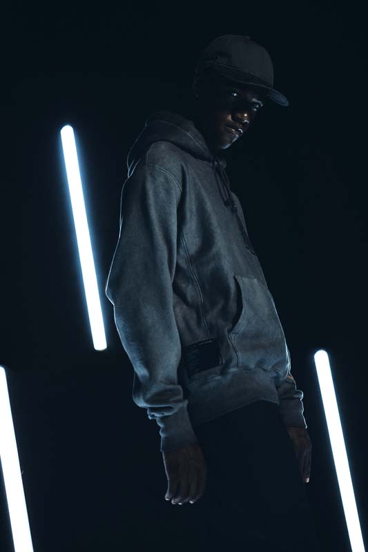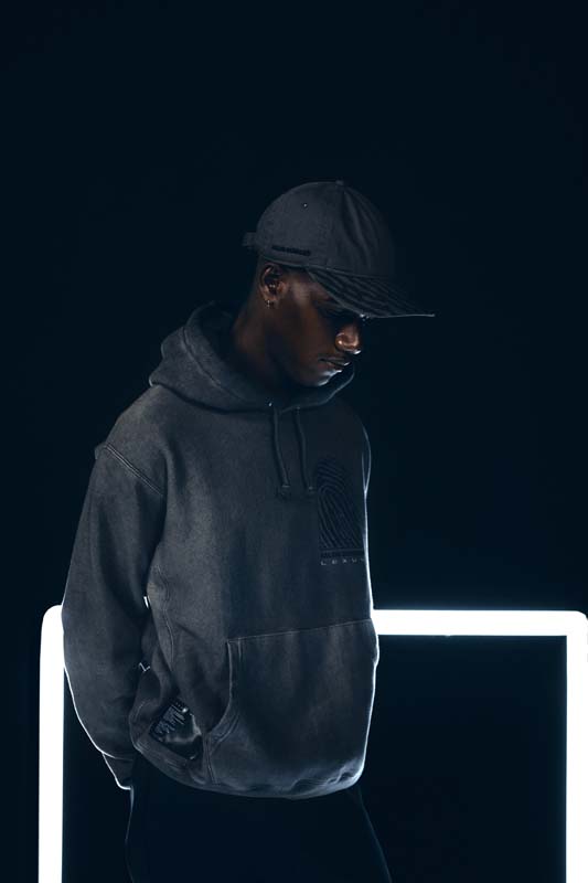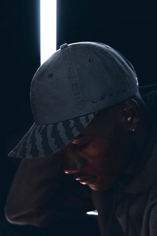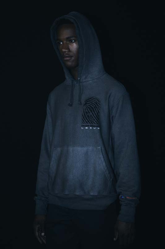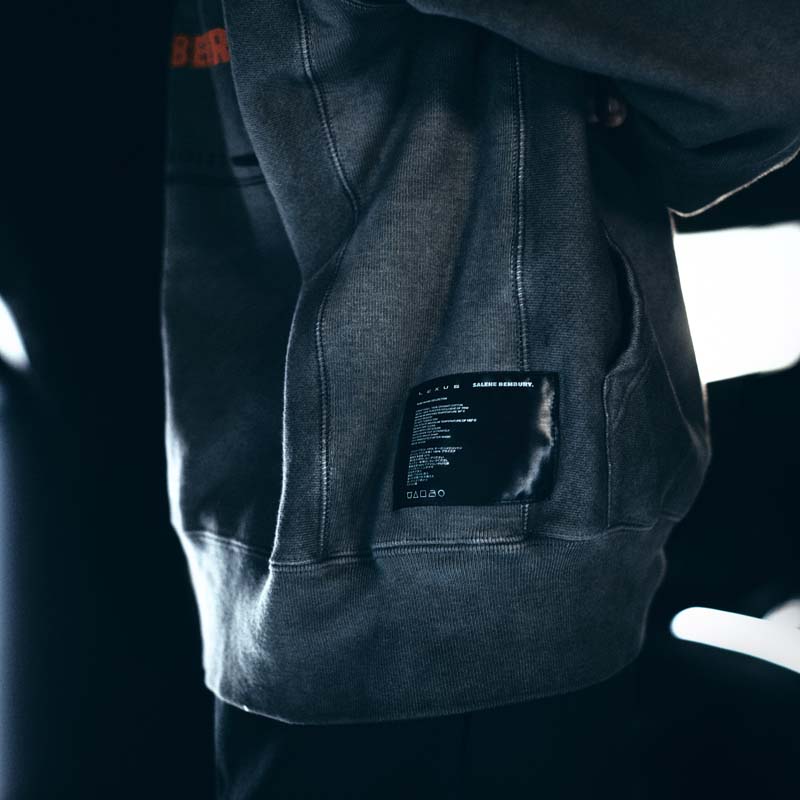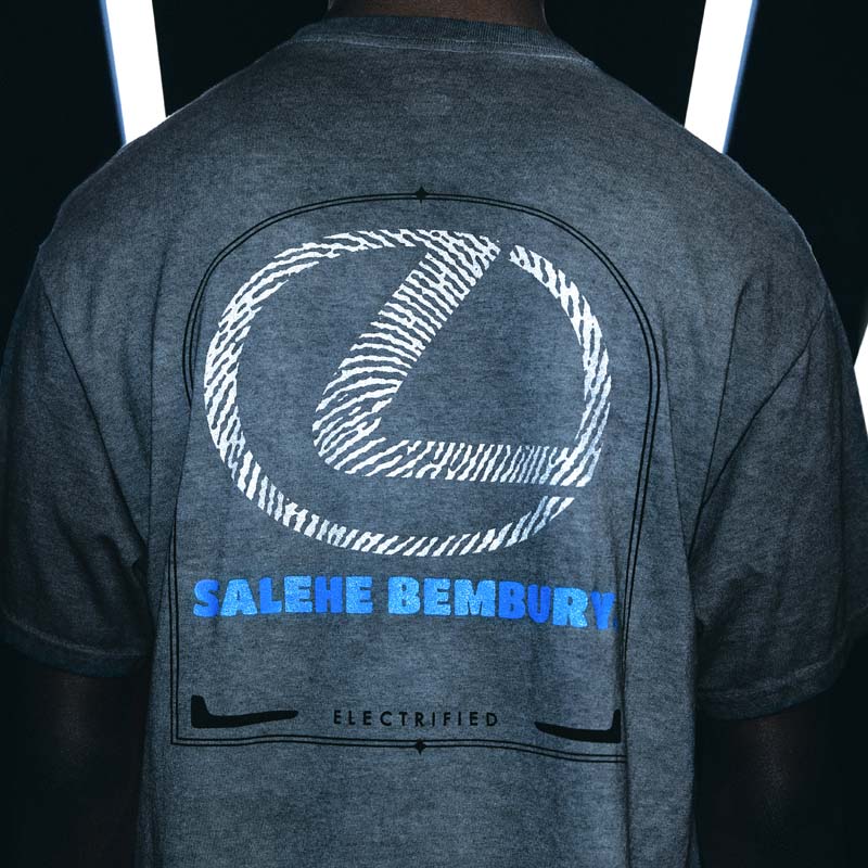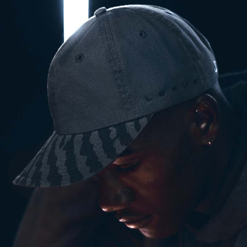 Lexus and Bembury identified Champion Reverse Weave as the best apparel silhouette for storytelling and took a deliberate approach with details that would amplify the collection’s narrative. For example, incorporation of reflective ink represents the idea of electrification and is used on both the T-shirt and hoodie. The fabric is dyed dark grey through a custom oil wash process, giving a unique look to the Champion apparel. Colors are drawn from the Lexus NX exterior options and the incorporation of a hand-finished, wash tag appliqué in both English and Japanese at the front hem ties together all of the brands working on the project. The focal point of the unstructured baseball cap is Salehe’s fingerprint logo wrapping the brim. In addition, embroidered Salehe, Lexus and Champion logos complete the piece, which is adjustable using a strap and metal buckle.