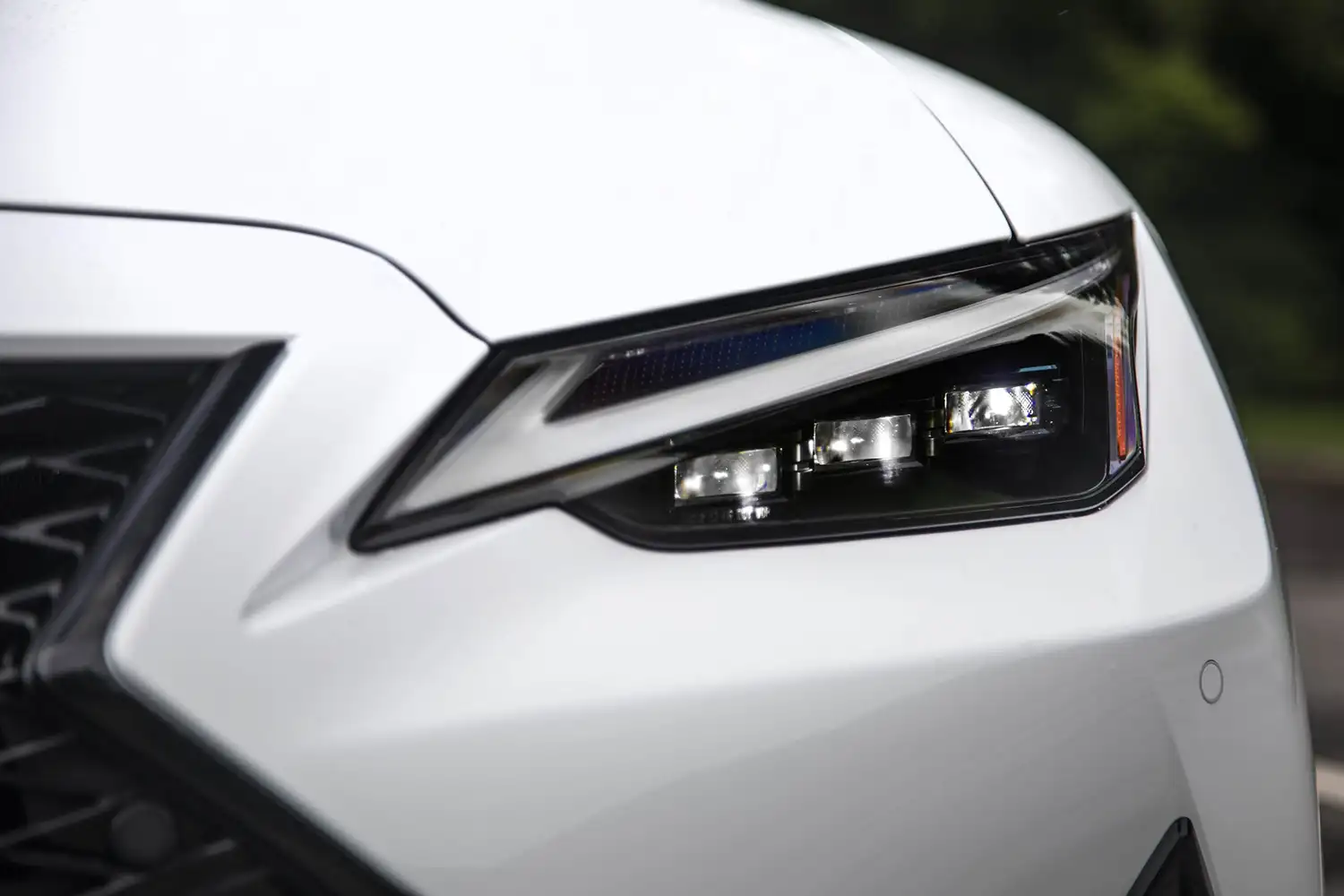 Slender headlamps are fitted on the IS that feature daytime running lights with a sharp L-shape signature that runs across the lateral axis just above the compact and lightweight lamp units. These headlamps help contribute to expressing a low center of gravity through low-positioned areas around the grille, and they are matched by lowered side character lines that carry all the way through to the rear of trunk. Available triple-beam LED headlights are also redesigned to complement the low-profile hood.