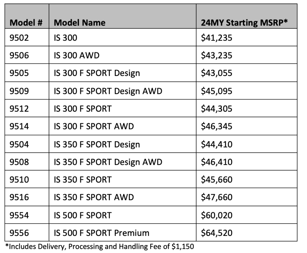 Known for its superior value, powerful performance and exceptional craftsmanship, the IS continues to be a popular Lexus sedan for first time luxury owners. For 2024, the IS line broadens its available options with the addition of the IS 300 F SPORT and F SPORT Design grades. IS 350 will offer an available F SPORT Blackout Package. And, back by popular demand, the Special Appearance Package will return on the IS 500 F SPORT Performance Premium grade in head-turning Blue Vector. The 2024 IS line is expected to go on sale later this fall.
