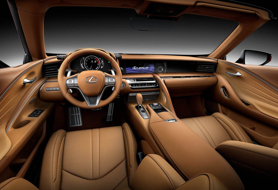 Lexus is renowned for its build quality, and the LC-Convertible is a prime example of elegant styling, sleek, aerodynamic body forms, and exceptional road presence. Meticulously crafted to look fast even when it’s standing still, the LC-Convertible is expressive and almost fluid-like, with flowing lines that accentuate the curves of the bodywork. The door handles are recessed and as you approach the vehicle they softly extend and are illuminated by LED lights. When the doors close, the handles smoothly flow back into their recess, giving the exterior a flawlessly smooth and aerodynamic surface. The light clusters mould perfectly into the nose and tail so that nothing interrupts those flowing lines. It’s little touches like this that elevate the LC above and beyond the norm for convertibles.
