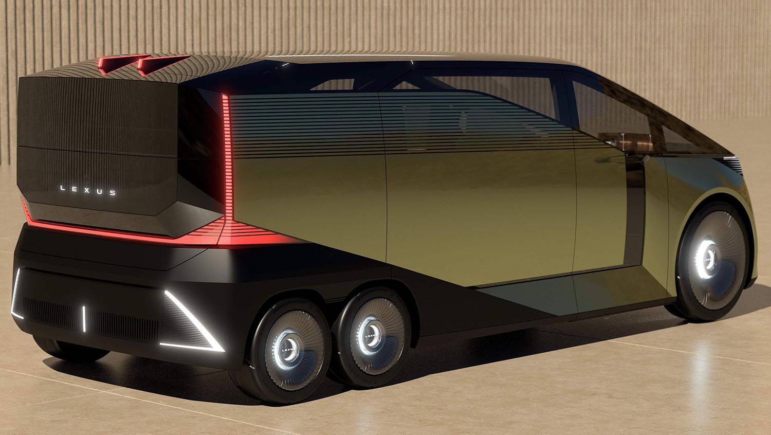 Lexus has pushed the boundaries of automotive design with a six-wheeled configuration. The rear axle carries four smaller wheels, giving the van a distinct stance while enhancing stability. Its elongated body stretches beyond any current LS model.
