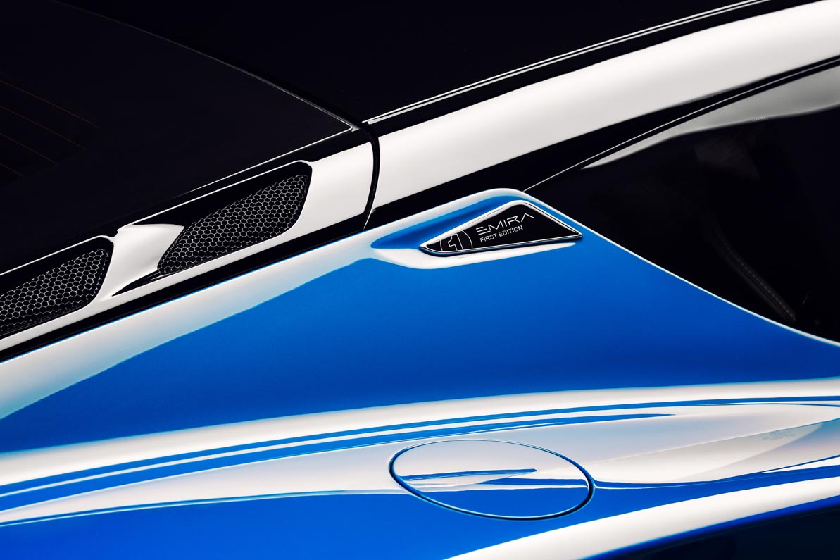 I think that the sculpture around the body side air intake is my favourite. The surfaces are incredibly three dimensional and designed to channel the airflow into the bodyside duct. There aren’t many cars in the world with this amount of form and drama in them, technical and beautiful. We always intended the Emira’s design language to be that of a baby supercar.
